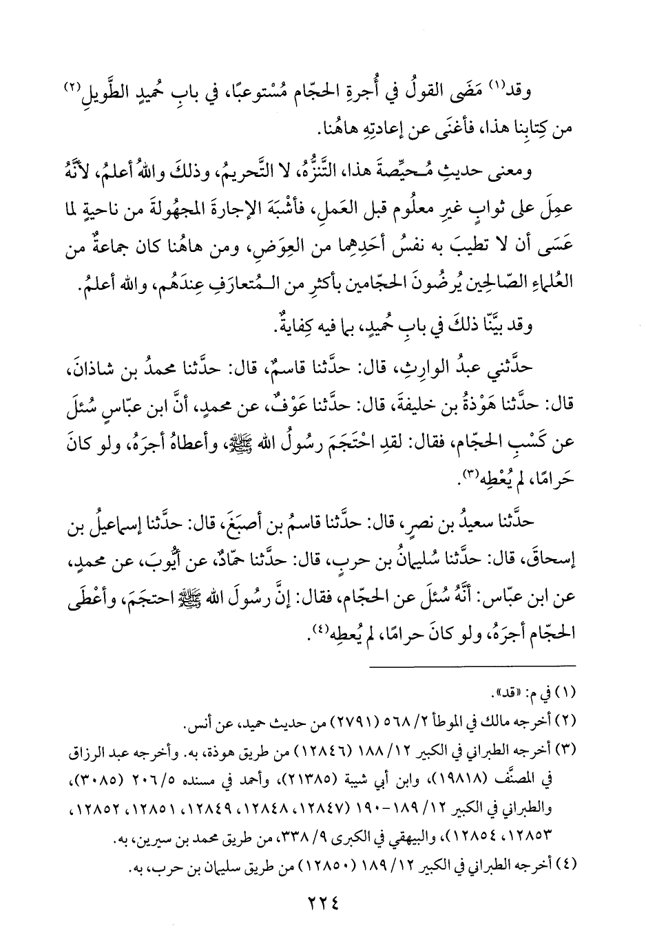حَدَّثَنَا سعيدُ بن نصرٍ، قال: حَدَّثَنَا قاسمُ بن أصبَغَ، قال: حَدَّثَنَا إسماعيلُ بن إسحاقَ، قال: حَدَّثَنَا سليمانُ بن حربٍ، قال: حَدَّثَنَا حمّادٌ، عن أيُّوبَ، عن محمدٍ، عن ابن عبّاس: أنَّهُ سُئلَ عن الحجّام، فقال: إنَّ رسُولَ الله - صَلَّى اللهُ عَلَيْهِ وَسَلَّمَ - احتجَمَ، وأعْطَى الحجّام أجرَه، ولو كانَ حرامًا، لَمْ يُعطِه (¬٤).