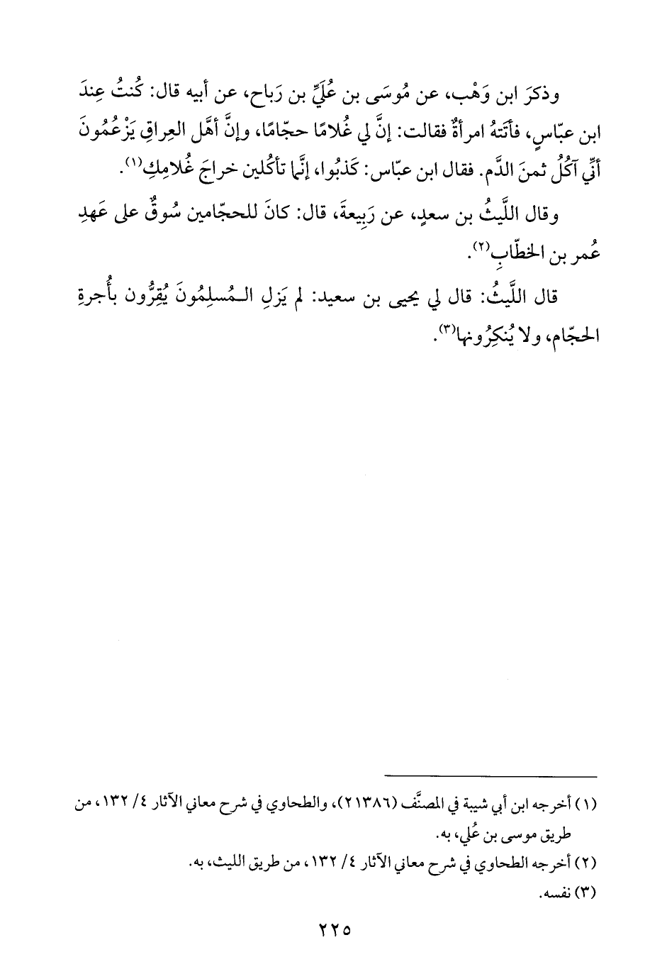 قال اللَّيثُ: قال لي يحيى بن سعيد: لَمْ يَزلِ المُسلِمُونَ يُقِرُّون بأُجرةِ الحجّام، ولا يُنكِرُونها (¬٣).