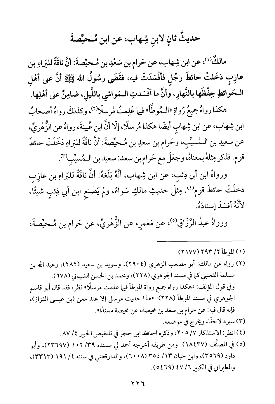 مالكٌ (¬١)، عن ابن شِهاب، عن حَرام بن سَعْدِ بن مُحيِّصةَ: أنَّ ناقَةً للبَراءِ بن عازِبٍ دَخَلتْ حائطَ رجُلٍ فأفْسَدَتْ فيه، فقَضَى رسُولُ الله - صَلَّى اللهُ عَلَيْهِ وَسَلَّمَ - أنَّ على أهْلِ الحَوائطِ حِفْظَها بالنَّهارِ، وأنَّ ما أفْسَدتِ المَواشي باللَّيلِ، ضامِنٌ على أهْلِها.
