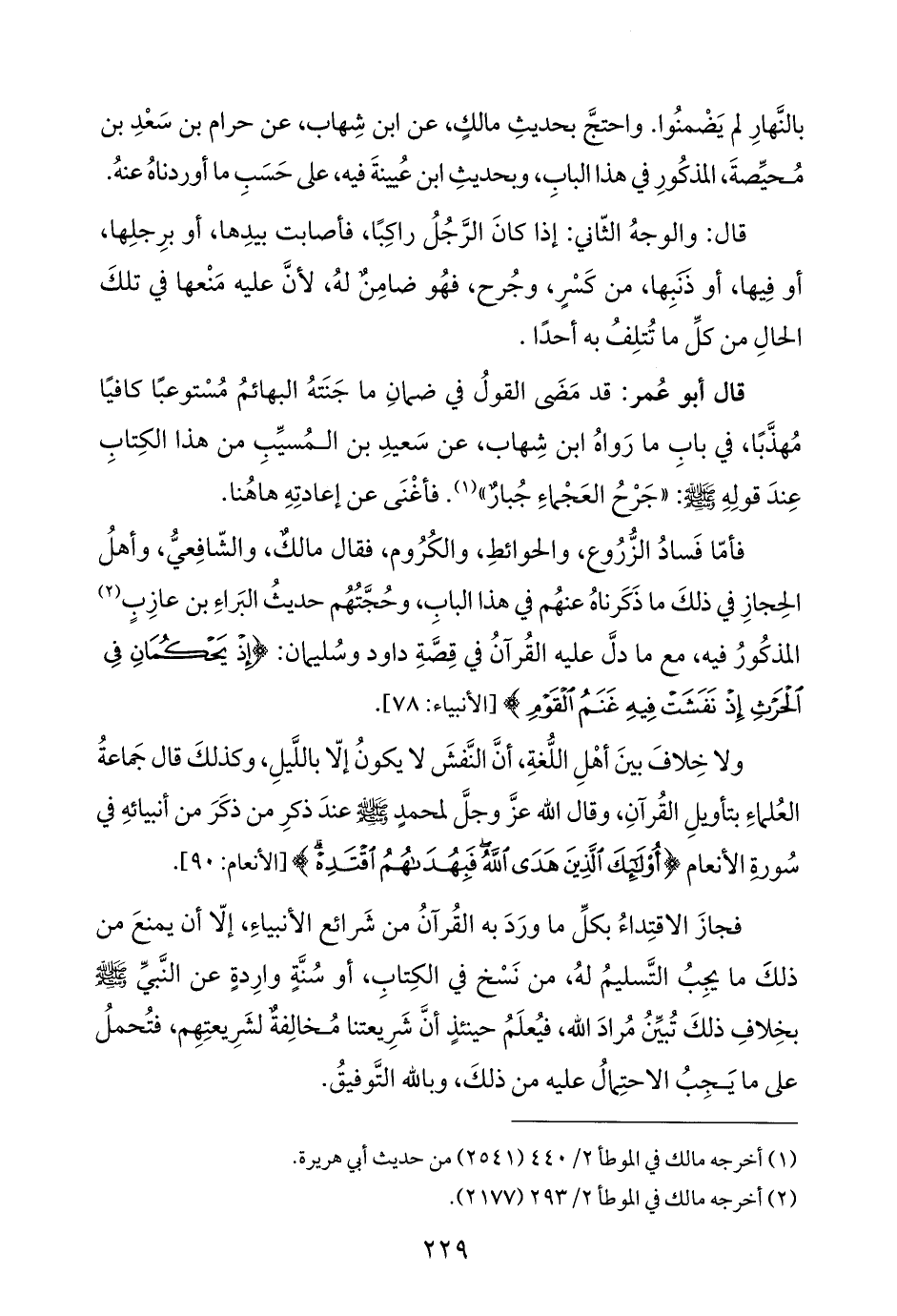 بالنَّهارِ لَمْ يَضْمنُوا. واحتجَّ بحديثِ مالكٍ، عن ابن شِهاب، عن حرام بن سَعْدِ بن مُحيِّصةَ، المذكُورِ في هذا البابِ، وبحديثِ ابن عُيينةَ فيه، على حَسَبِ ما أوردناهُ عنهُ.