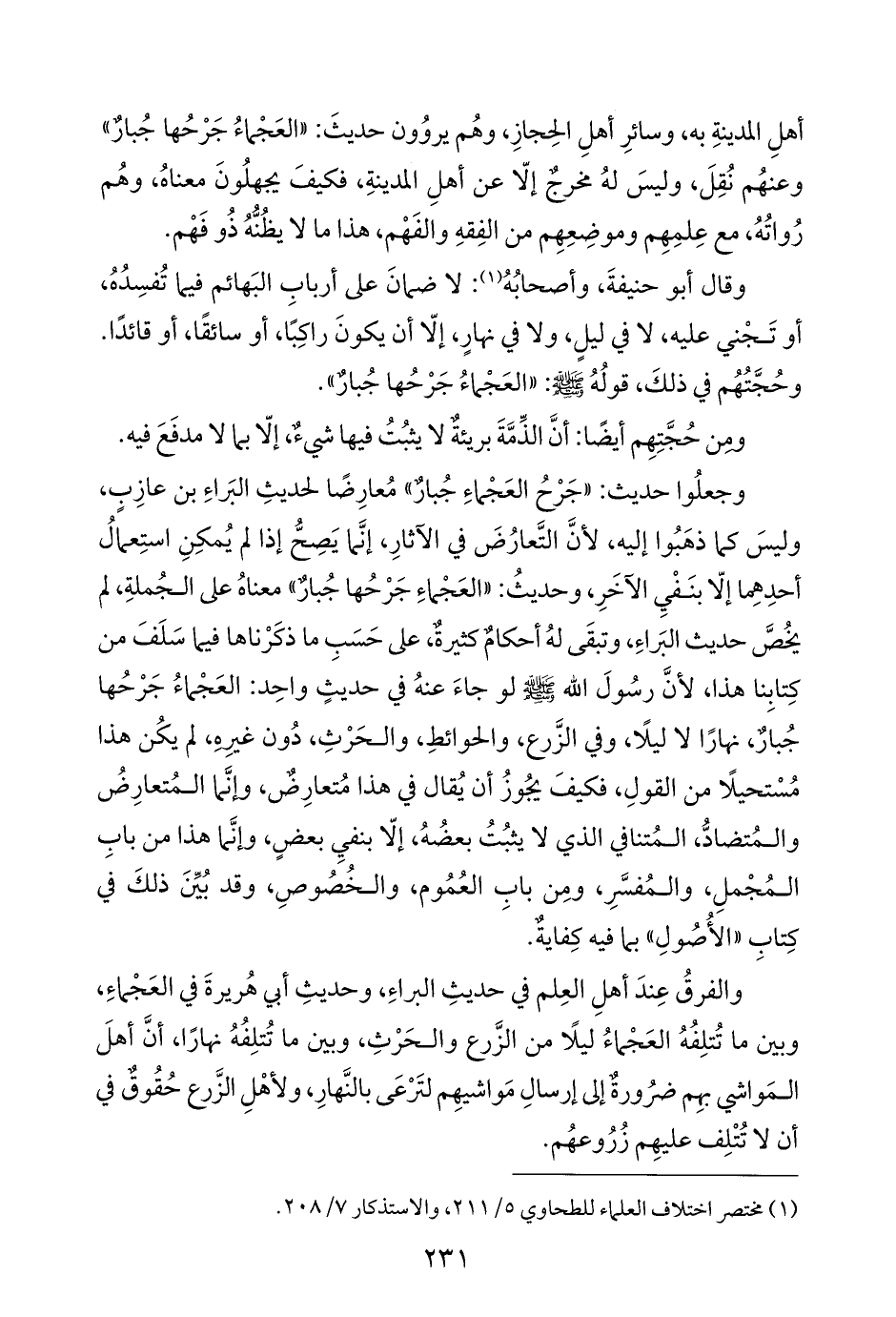 أهلِ المدينةِ به، وسائرِ أهلِ الحِجازِ، وهُم يروُون حديثَ: "العَجْماءُ جَرْحُها جُبارٌ" وعنهُم نُقِلَ، وليسَ لهُ مخرجٌ إلّا عن أهلِ المدينةِ، فكيفَ يجهلُونَ معناهُ، وهُم رُواتُهُ، مع عِلمِهِم وموضِعِهِم من الفِقهِ والفهْم، هذا ما لا يظُنُّهُ ذُو فَهْم.
