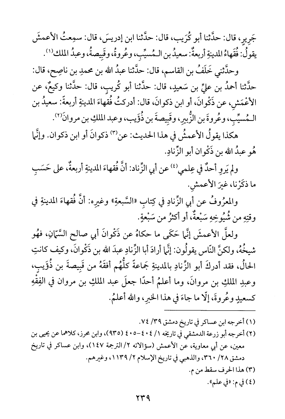 جَرِيرٍ، قال: حَدَّثَنَا أبو كُرَيب، قال: حَدَّثَنَا ابن إدريسَ، قال: سمِعتُ الأعمشَ يقولُ: فُقَهاءُ المدينةِ أربعةٌ: سعيدُ بن المُسيِّبِ، وعُروةُ، وقَبِيصةُ، وعبدُ الملك (¬١).