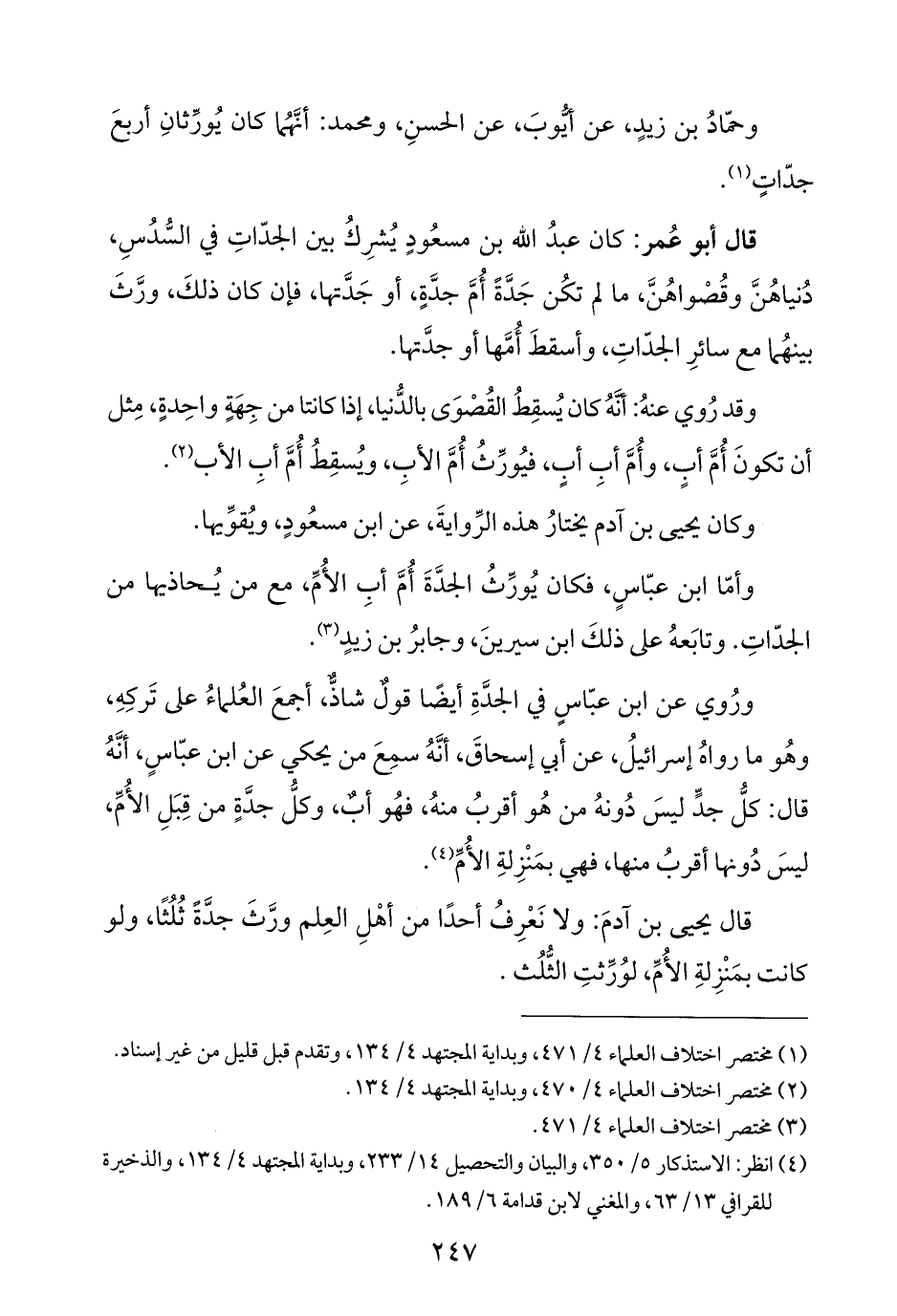 قال أبو عُمر: كان عبدُ الله بن مسعُودٍ يُشرِكُ بين الجدَّاتِ في السُّدُسِ، دُنياهُنَّ وقُصْواهُنَّ، ما لَمْ تكُن جَدَّةً أُمَّ جدَّةٍ، أو جَدَّتها، فإن كان ذلكَ، ورَّثَ بينهُما مع سائرِ الجدّاتِ، وأسقطَ أُمَّها أو جدَّتها.