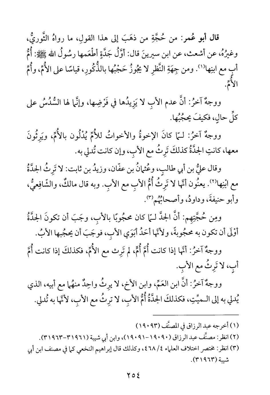 ومِن حُجَّتِهِم: أنَّ الجدَّ لمّا كان محجُوبًا بالأبِ، وجَبَ أن تكونَ الجدَّةُ أوْلَى أن تكون به محجُوبةً، ولأنَّها أحَدُ أَبَوَي الأبِ، فوجَبَ أن يحجُبها الأبُ.