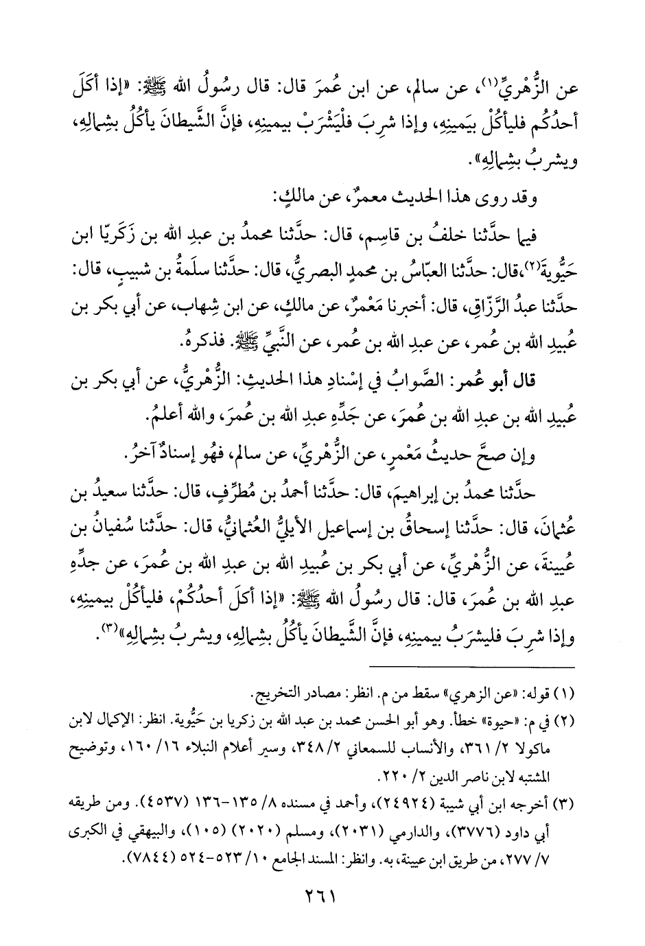 حَدَّثَنَا محمدُ بن إبراهيمَ، قال: حَدَّثَنَا أحمدُ بن مُطرِّفٍ، قال: حَدَّثَنَا سعيدُ بن عُثمانَ، قال: حَدَّثَنَا إسحاقُ بن إسماعيل الأيليُّ العُثمانيُّ، قال: حَدَّثَنَا سُفيانُ بن عُيينةَ، عن الزُّهْريِّ، عن أبي بكر بن عُبيدِ الله بن عبدِ الله بن عُمرَ، عن جدِّهِ عبدِ الله بن عُمرَ، قال: قال رسُولُ الله - صَلَّى اللهُ عَلَيْهِ وَسَلَّمَ -: "إذا أكلَ أحدُكُمْ، فليأكُلْ بيمينِهِ، وإذا شرِبَ فليشرَبُ بيمينِهِ، فإنَّ الشَّيطانَ يأكُلُ بشِمالِهِ، ويشربُ بشِمالِهِ" (¬٣).
