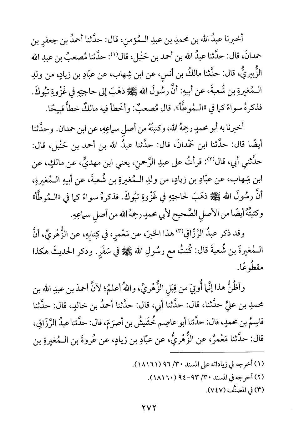 أخبرنا به أبو محمدٍ رحِمهُ الله، وكتبتُهُ من أصلِ سماعِهِ، عن ابن حمدان. وحدَّثنا أيضًا قال: حدَّثنا ابن حَمْدانَ، قال: حدَّثنا عبدُ الله بن أحمد بن حَنْبل، قال: حدَّثني أبي، قال (¬٢): قرأتُ على عبدِ الرَّحمنِ، يعني ابن مهديٍّ، عن مالكٍ، عن ابن شِهاب، عن عبّادِ بن زيادٍ، من ولدِ المُغيرةِ بن شُعبةَ، عن أبيهِ المُغيرةِ، أنَّ رسُولَ الله - صلى الله عليه وسلم - ذهَبَ لحاجتِهِ في غَزْوةِ تبُوكَ. فذكرهُ سواءً كما في "المُوطَّأ" وكتبتُهُ أيضًا من الأصلِ الصَّحيح لأبي محمدٍ رحِمهُ الله من أصلِ سماعِهِ.