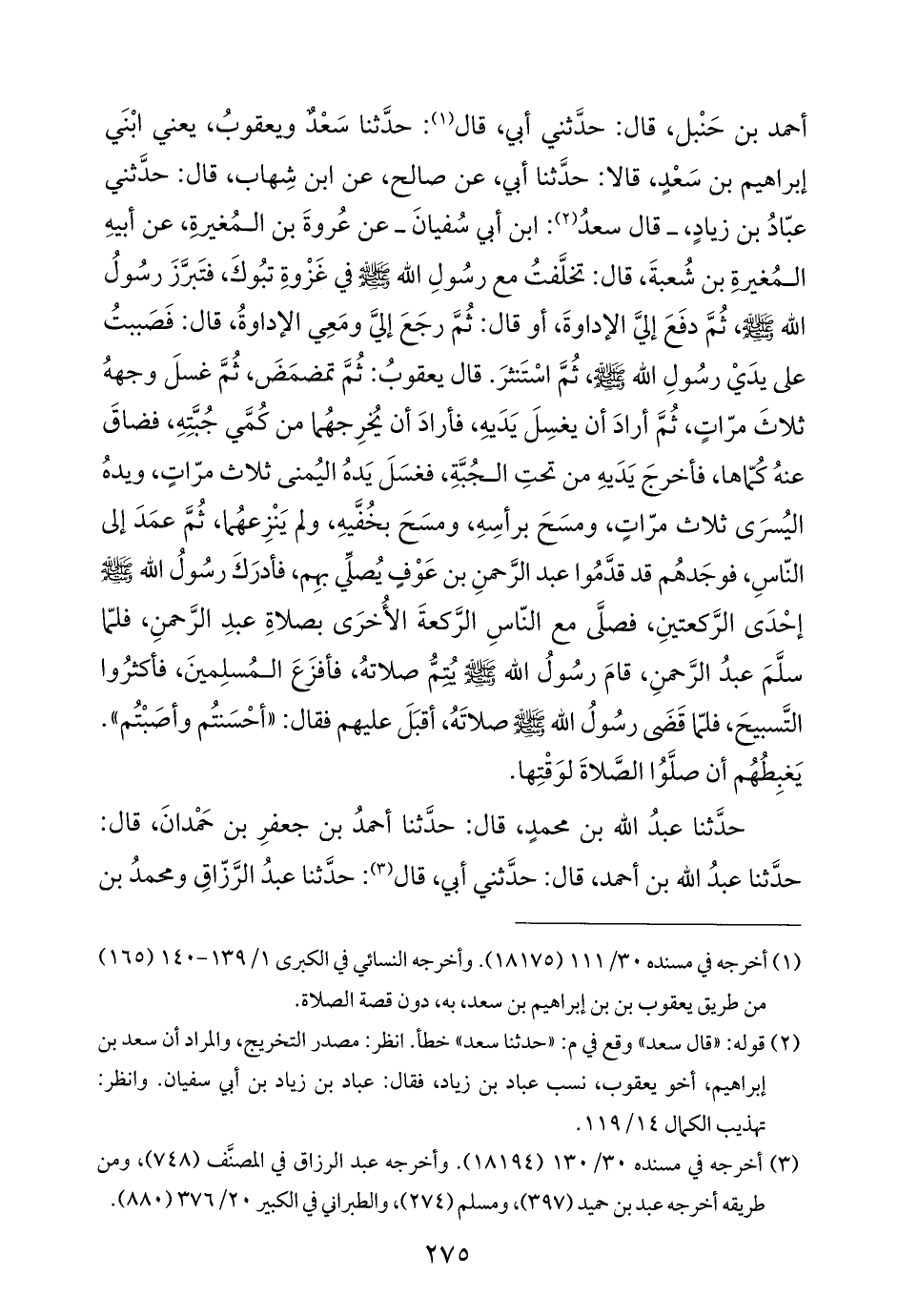 أحمد بن حَنْبل، قال: حدَّثني أبي، قال (¬١): حدَّثنا سَعْدٌ ويعقوبُ، يعني ابْنَي إبراهيم بن سَعْدٍ، قالا: حدَّثنا أبي، عن صالح، عن ابن شِهاب، قال: حدَّثني عبّادُ بن زيادٍ، - قال سعدُ (¬٢): ابن أبي سُفيانَ - عن عُروةَ بن المُغيرةِ، عن أبيهِ المُغيرةِ بن شُعبةَ، قال: تخلَّفتُ مع رسُولِ الله - صلى الله عليه وسلم - في غَزْوةِ تبُوكَ، فتَبرَّزَ رسُولُ الله - صلى الله عليه وسلم -، ثُمَّ دفَعَ إليَّ الإداوةَ، أو قال: ثُمَّ رجَعَ إليَّ ومَعِي الإداوةُ، قال: فَصَببتُ على يدَيْ رسُولِ الله - صلى الله عليه وسلم -، ثُمَّ اسْتَنثرَ. قال يعقوبُ: ثُمَّ تمضمَضَ، ثُمَّ غسلَ وجههُ ثلاثَ مرّاتٍ، ثُمَّ أرادَ أن يغسِلَ يَدَيهِ، فأرادَ أن يُخرِجهُما من كُمَّي جُبَّتِهِ، فضاقَ عنهُ كُمّاها، فأخرجَ يَدَيهِ من تحتِ الجُبَّةِ، فغسَلَ يَدهُ اليُمنى ثلاث مرّاتٍ، ويدهُ اليُسرَى ثلاث مرّاتٍ، ومسَحَ برأسِهِ، ومسَحَ بخُفَّيهِ، ولم يَنْزِعهُما، ثمَّ عمَدَ إلى النّاسِ، فوجَدهُم قد قدَّمُوا عبد الرَّحمنِ بن عَوْفٍ يُصلِّي بهِم، فأدرَكَ رسُولُ الله - صلى الله عليه وسلم - إحْدَى الرَّكعتينِ، فصلَّى مع النّاسِ الرَّكعةَ الأُخرَى بصلاةِ عبدِ الرَّحمنِ، فلمّا سلَّمَ عبدُ الرَّحمنِ، قامَ رسُولُ الله - صلى الله عليه وسلم - يُتِمُّ صلاتهُ، فأفزَعَ المُسلِمينَ، فأكثرُوا التَّسبيحَ، فلمّا قَضَى رسُولُ الله - صلى الله عليه وسلم - صلاتَهُ، أقبَلَ عليهم فقال: "أحْسَنتُم وأصَبْتُم". يَغبِطُهُم أن صلَّوُا الصَّلاةَ لوَقْتِها.