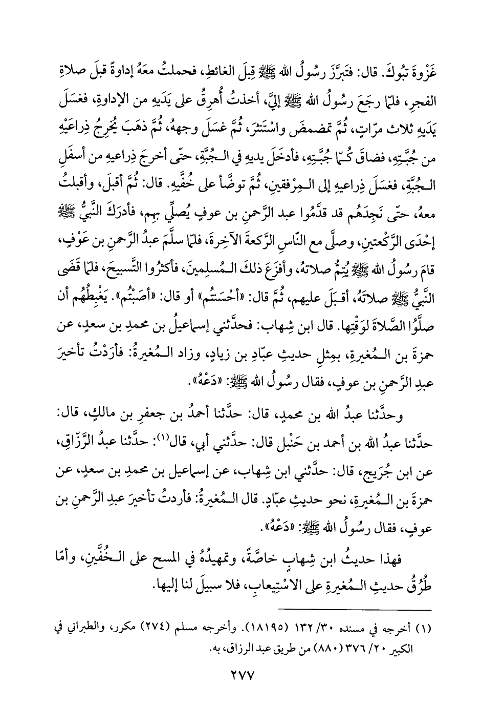 وحدَّثنا عبدُ الله بن محمدٍ، قال: حدَّثنا أحمدُ بن جعفرِ بن مالكٍ، قال: حدَّثنا عبدُ الله بن أحمد بن حَنْبل قال: حدَّثني أبي، قال (¬١): حدَّثنا عبدُ الرَّزّاقِ، عن ابن جُرَيج، قال: حدَّثني ابن شِهاب، عن إسماعيل بن محمدِ بن سعدٍ، عن حمزةَ بن المُغيرةِ، نحو حديثِ عبّادٍ. قال المُغيرةُ: فأردتُ تأخيرَ عبدِ الرَّحمنِ بن عوفٍ، فقال رسُولُ الله - صلى الله عليه وسلم -: "دَعْهُ".