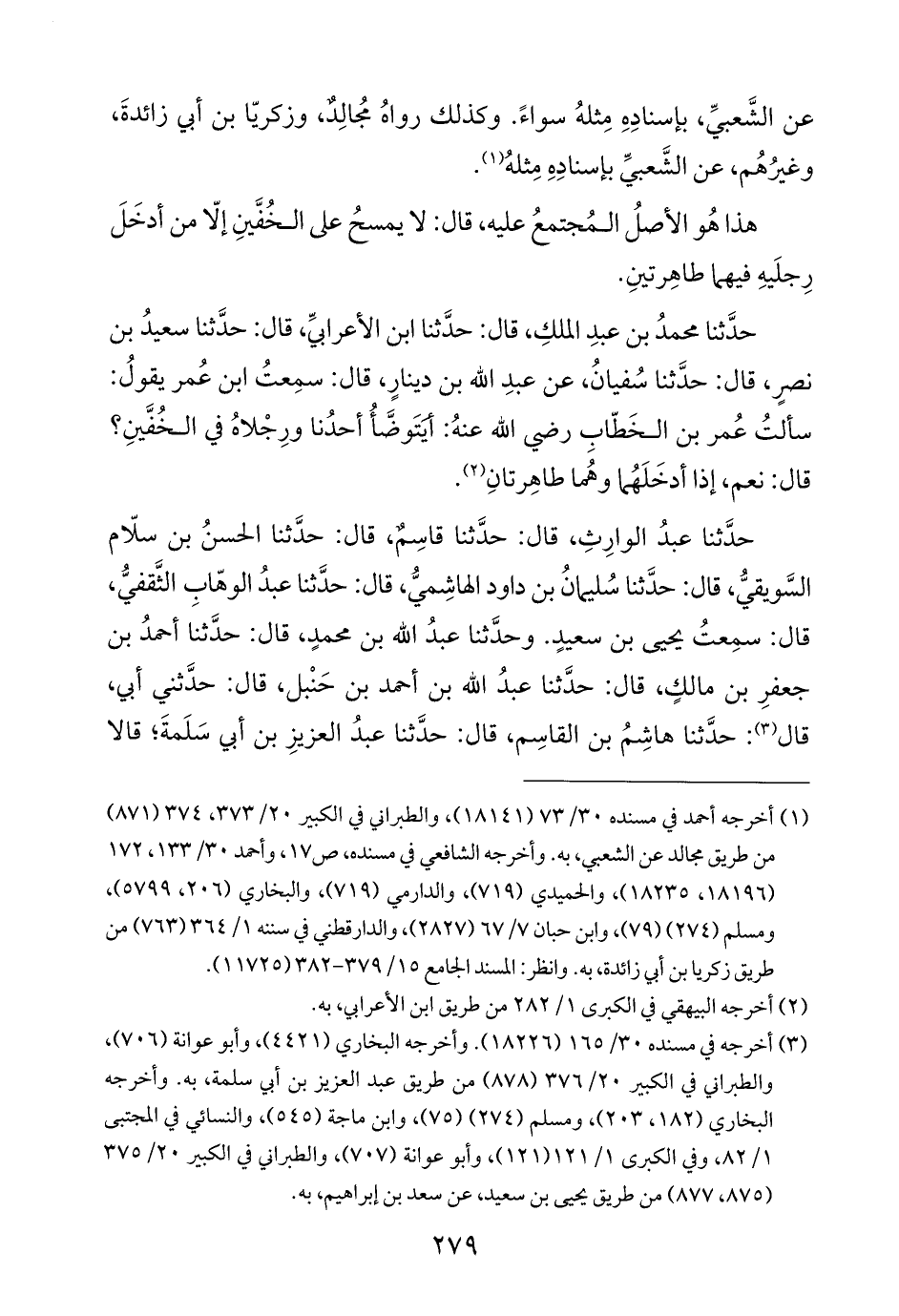 حدَّثنا محمدُ بن عبدِ الملكِ، قال: حدَّثنا ابن الأعرابيِّ، قال: حدَّثنا سعيدُ بن نصرٍ، قال: حدَّثنا سُفيانُ، عن عبدِ الله بن دينارٍ، قال: سمِعتُ ابن عُمر يقولُ: سألتُ عُمر بن الخَطّابِ رضي الله عنهُ: أيَتَوضَّأُ أحدُنا ورِجْلاهُ في الخُفَّينِ؟ قال: نعم، إذا أدخَلَهُما وهُما طاهِرتانِ (¬٢).