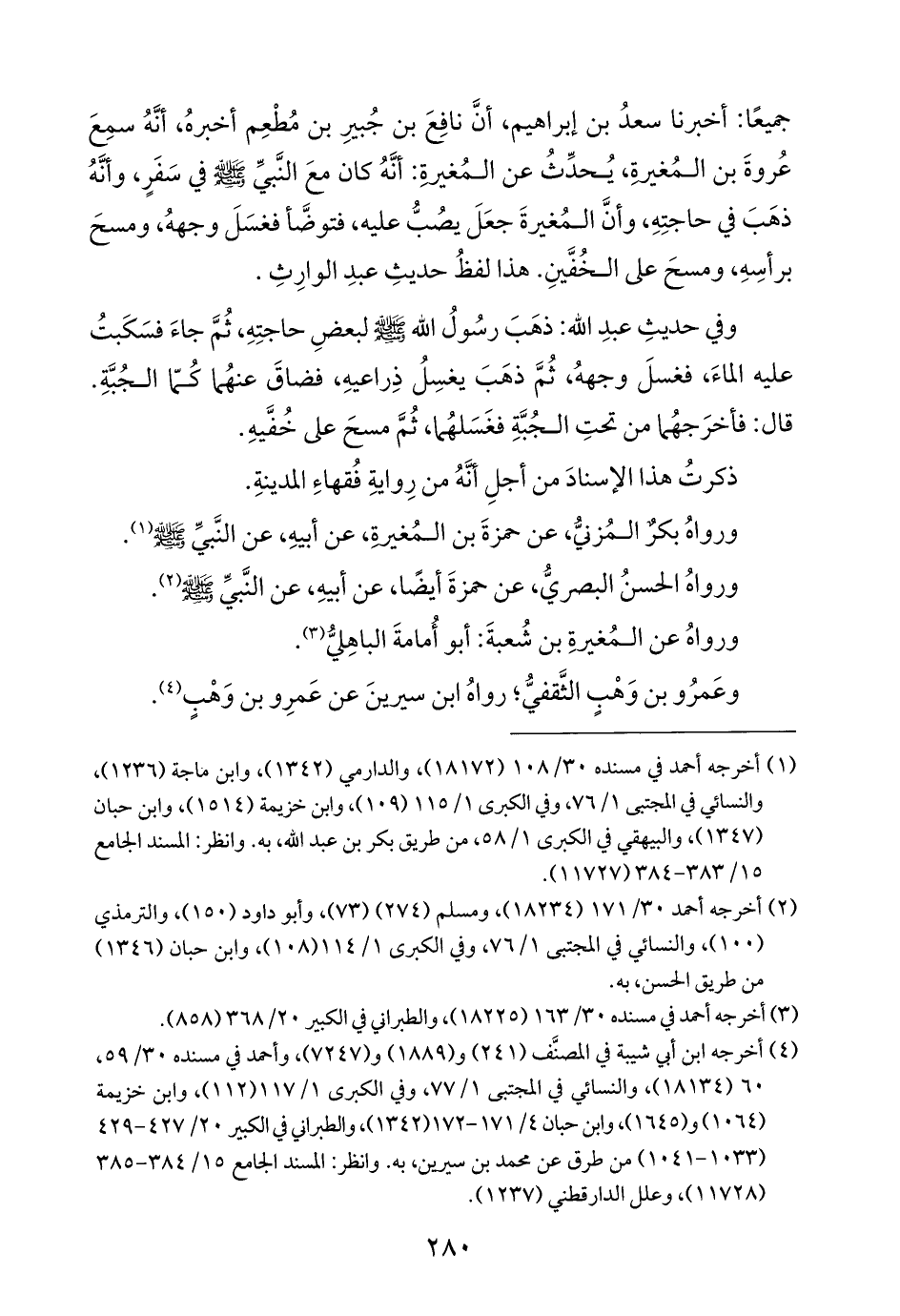 جميعًا: أخبرنا سعدُ بن إبراهيم، أنَّ نافِعَ بن جُبيرِ بن مُطْعِم أخبرهُ، أنَّهُ سمِعَ عُروةَ بن المُغيرةِ، يُحدِّثُ عن المُغيرةِ: أنَّهُ كان معَ النَّبيِّ - صلى الله عليه وسلم - في سَفَرٍ، وأنَّهُ ذهَبَ في حاجتِهِ، وأنَّ المُغيرةَ جعَلَ يصُبُّ عليه، فتوضَّأ فغسَلَ وجههُ، ومسحَ برأسِهِ، ومسحَ على الخُفَّينِ. هذا لفظُ حديثِ عبدِ الوارِثِ.