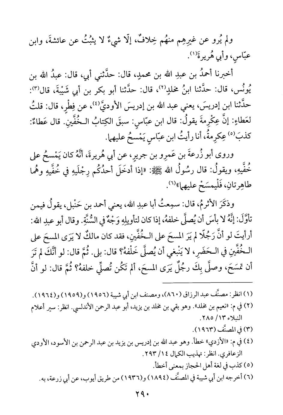 أخبرنا أحمدُ بن عبدِ الله بن محمدٍ، قال: حدَّثني أبي، قال: عبدُ الله بن يُونُس، قال: حدَّثنا ابنُ مخلدٍ (¬٢)، قال: حدَّثنا أبو بكر بن أبي شَيْبةَ، قال (¬٣): حدَّثنا ابن إدريسَ، يعني عبد الله بن إدريسَ الأوديَّ (¬٤)، عن فِطْرٍ، قال: قلتُ لعَطاءٍ: إنَّ عِكْرِمةَ يقولُ: قال ابن عبّاسٍ: سبقَ الكِتابُ الخُفَّينِ. قال عَطاءٌ: كذبَ (¬٥) عِكرِمةُ، أنا رأيتُ ابن عبّاسٍ يَمْسحُ عليهما.