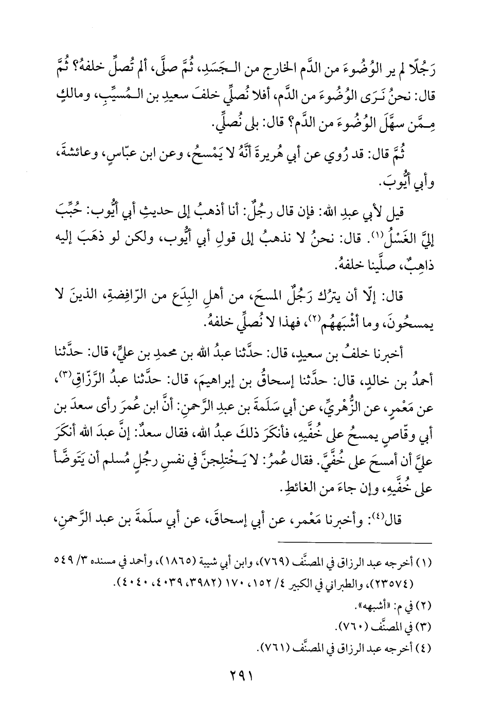 أخبرنا خلفُ بن سعيدٍ، قال: حدَّثنا عبدُ الله بن محمدِ بن عليٍّ، قال: حدَّثنا أحمدُ بن خالدٍ، قال: حدَّثنا إسحاقُ بن إبراهيمَ، قال: حدَّثنا عبدُ الرَّزّاقِ (¬٣)، عن مَعْمرٍ، عن الزُّهْريِّ، عن أبي سَلَمةَ بن عبدِ الرَّحمنِ: أنَّ ابن عُمرَ رأى سعدَ بن أبي وقّاصٍ يمسحُ على خُفَّيهِ، فأنكَرَ ذلكَ عبدُ الله، فقال سعدٌ: إنَّ عبدَ الله أنكَرَ عليَّ أن أمسحَ على خُفَّيَّ. فقال عُمرُ: لا يَخْتلِجنَّ في نفسِ رجُلٍ مُسلم أن يَتَوضَّأ على خُفَّيهِ، وإن جاءَ من الغائطِ.
