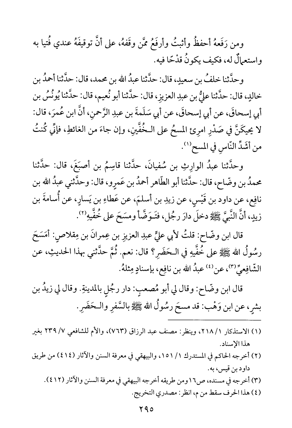 قال ابن وضّاح: وقال لي أبو مُصعبٍ: دار رجُلٍ بالمدينةِ. وقال لي زيدُ بن بشرٍ، عن ابن وَهْب: قد مسحَ رسُولُ الله - صلى الله عليه وسلم - بالسَّفرِ والحَضَرِ.