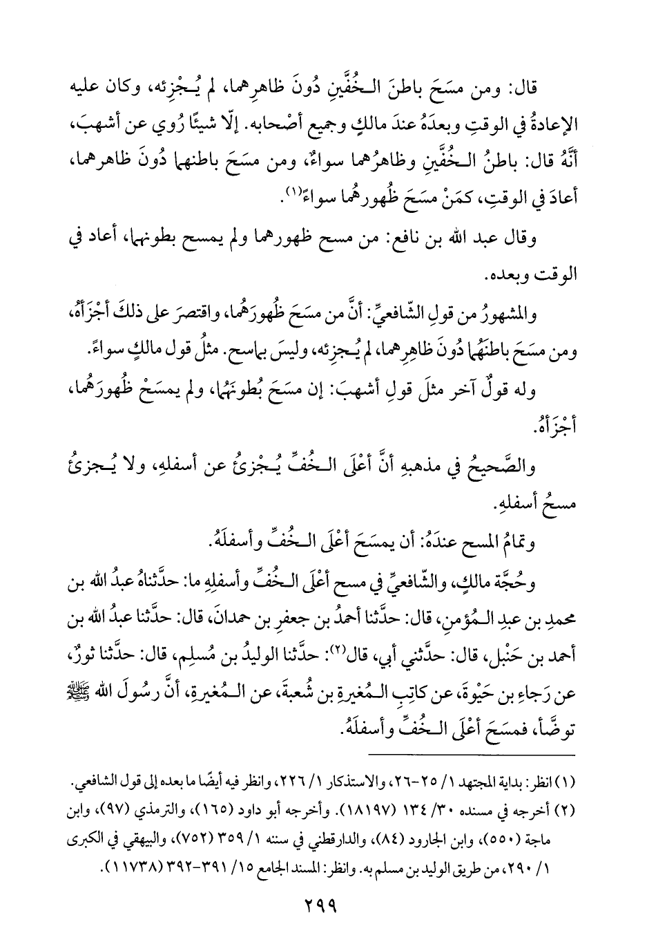 وحُجَّة مالكٍ، والشّافعيِّ في مسح أعْلَى الخُفِّ وأسفلِهِ ما: حدَّثناهُ عبدُ الله بن محمدِ بن عبدِ المُؤمنِ، قال: حدَّثنا أحمدُ بن جعفرِ بن حمدانَ، قال: حدَّثنا عبدُ الله بن أحمد بن حَنْبل، قال: حدَّثني أبي، قال (¬٢): حدَّثنا الوليدُ بن مُسلِم، قال: حدَّثنا ثورٌ، عن رَجاءِ بن حَيْوةَ، عن كاتِبِ المُغيرةِ بن شُعبةَ، عن المُغيرةِ، أنَّ رسُولَ الله - صلى الله عليه وسلم - توضَّأ، فمسَحَ أعْلَى الخُفِّ وأسفلَهُ.