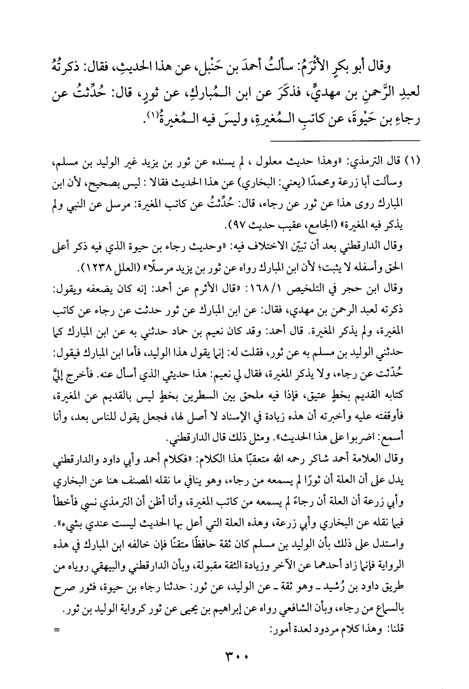 (¬١) قال الترمذي: "وهذا حديث معلول، لم يسنده عن ثور بن يزيد غير الوليد بن مسلم، وسألت أبا زرعة ومحمدًا (يعني: البخاري) عن هذا الحديث فقالا: ليس بصحيح، لأن ابن المبارك روى هذا عن ثور عن رجاء، قال: حُدِّثتُ عن كاتب المغيرة: مرسل عن النبي ولم يذكر فيه المغيرة" (الجامع، عقيب حديث ٩٧).