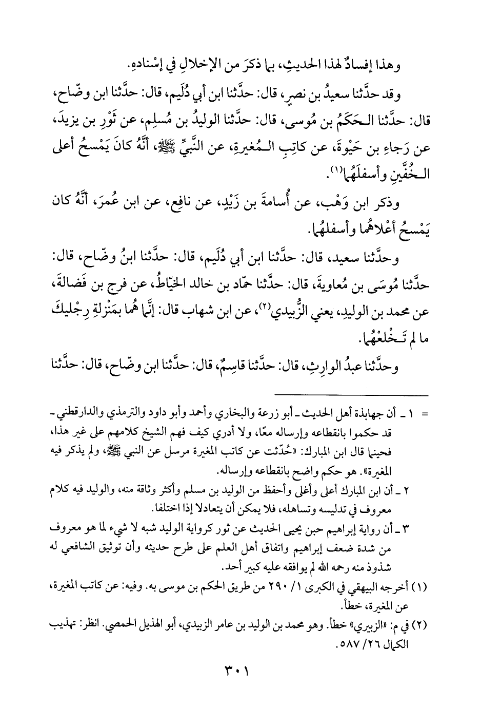 وقد حدَّثنا سعيدُ بن نصرٍ، قال: حدَّثنا ابن أبي دُلَيم، قال: حدَّثنا ابن وضّاح، قال: حدَّثنا الحَكَمُ بن مُوسى، قال: حدَّثنا الوليدُ بن مُسلِم، عن ثَوْرِ بن يزيدَ، عن رَجاءِ بن حَيْوةَ، عن كاتِبِ المُغيرةِ، عن النَّبيِّ - صلى الله عليه وسلم -، أنَّهُ كانَ يَمْسحُ أعلى الخُفَّينِ وأسفلَهُما (¬١).