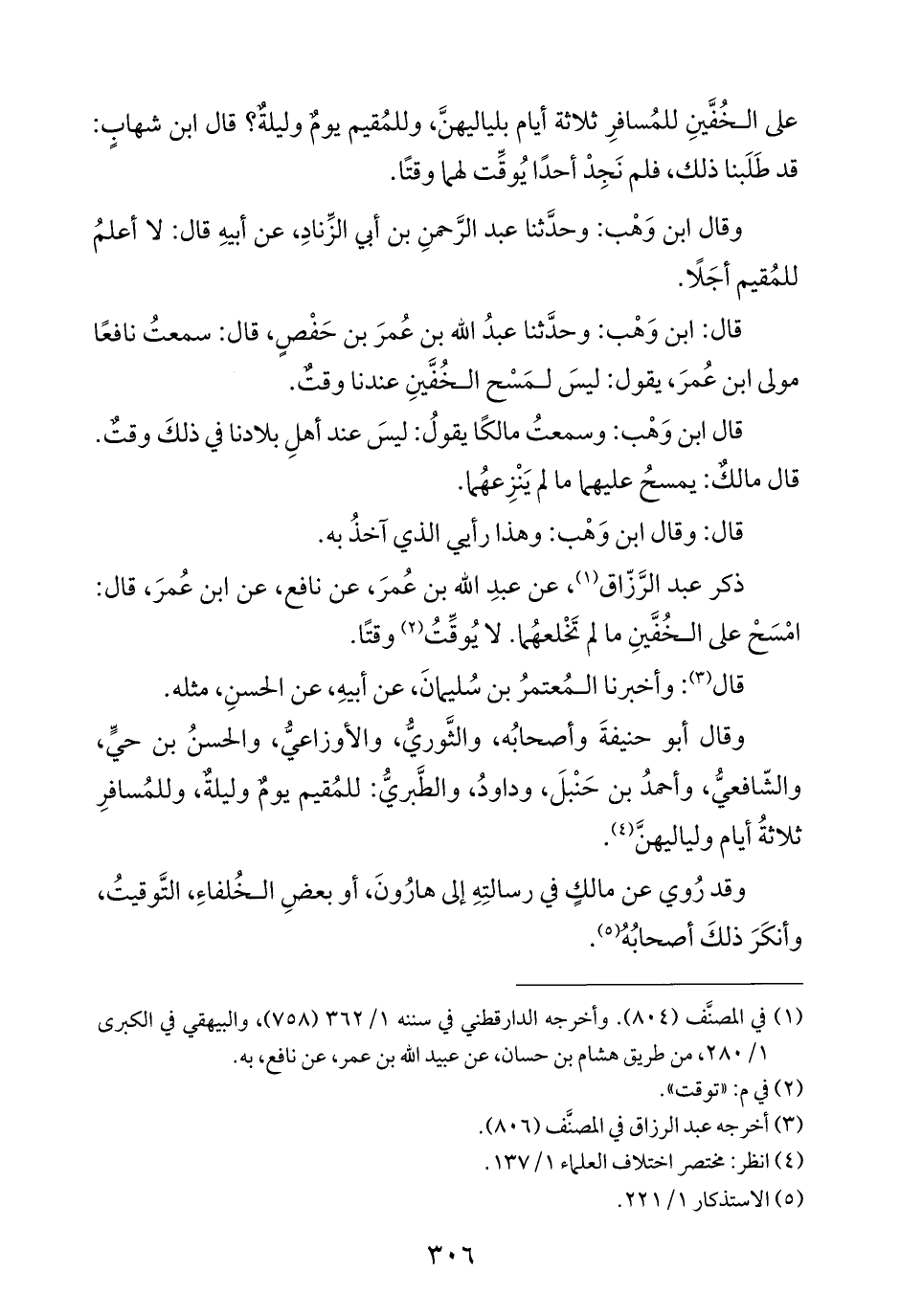 قال: ابن وَهْب: وحدَّثنا عبدُ الله بن عُمرَ بن حَفْصٍ، قال: سمعتُ نافعًا مولى ابن عُمرَ، يقول: ليسَ لمَسْح الخُفَّينِ عندنا وقتٌ.
