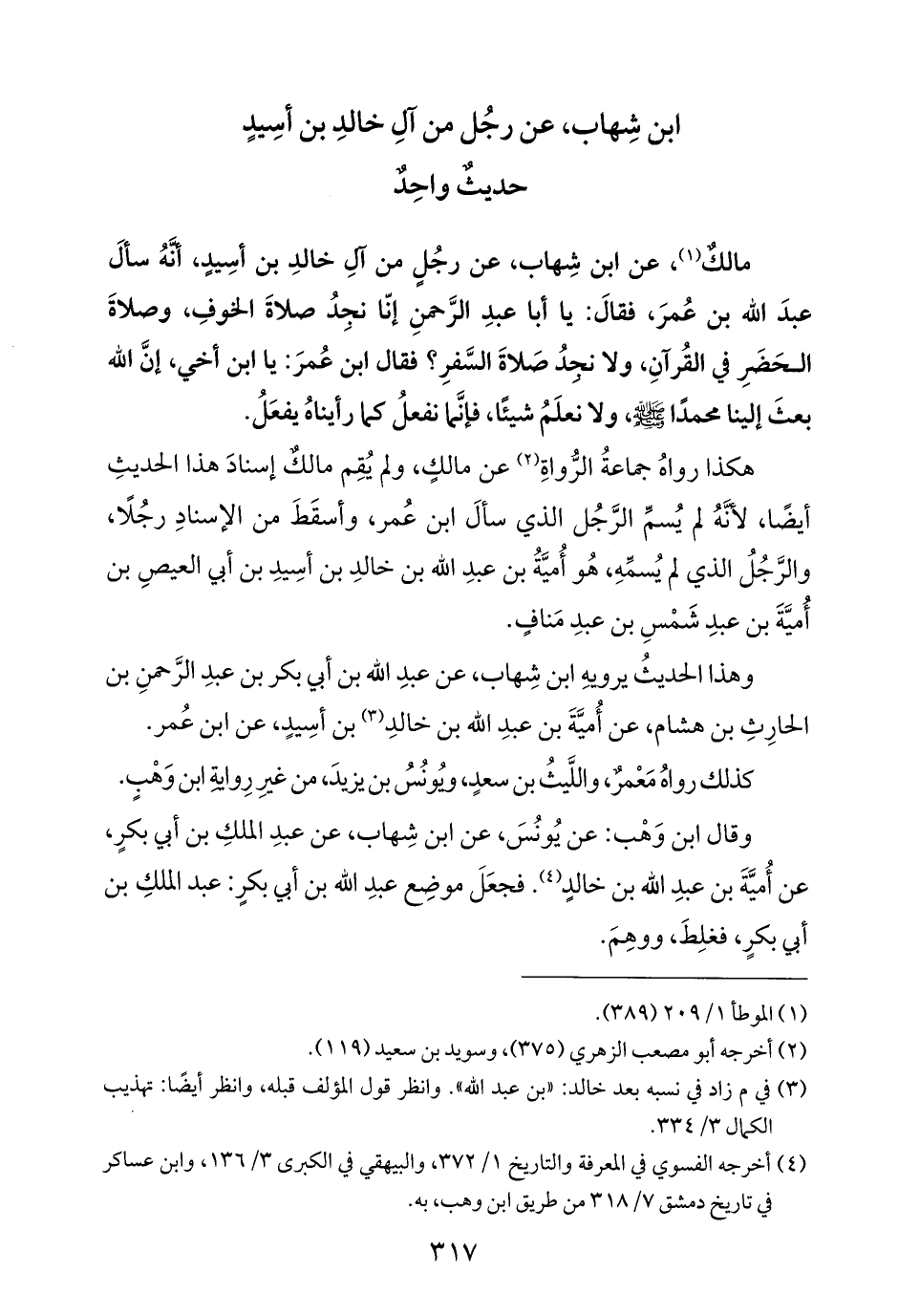 هكذا رواهُ جماعةُ الرُّواةِ (¬٢) عن مالكٍ، ولم يُقِم مالكٌ إسنادَ هذا الحديثِ أيضًا، لأنَّهُ لَمْ يُسمِّ الرَّجُل الذي سألَ ابن عُمر، وأسقَطَ من الإسنادِ رجُلًا، والرَّجُلُ الذي لَمْ يُسمِّهِ، هُو أُميَّةُ بن عبدِ الله بن خالدِ بن أسِيدِ بن أبي العيصِ بن أُميَّةَ بن عبدِ شَمْسِ بن عبدِ مَنافٍ.