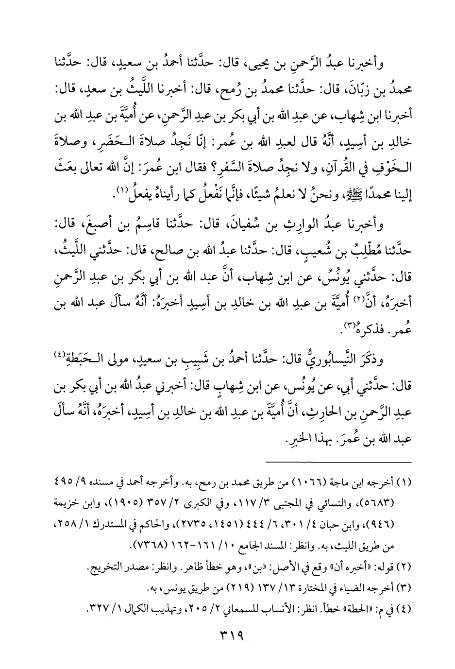 وأخبرنا عبدُ الرَّحمنِ بن يحيى، قال: حَدَّثَنَا أحمدُ بن سعيدٍ، قال: حَدَّثَنَا محمدُ بن زبّانَ، قال؛ حَدَّثَنَا محمدُ بن رُمح، قال: أخبرنا اللَّيثُ بن سعدٍ، قال: أخبرنا ابن شِهاب، عن عبدِ الله بن أبي بكر بن عبدِ الرَّحمنِ، عن أُميَّةَ بن عبدِ الله بن خالدِ بن أسِيدٍ، أنَّهُ قال لعبدِ الله بن عُمر: إنّا نَجِدُ صلاةَ الحَضَرِ، وصلاةَ الخَوْفِ في القُرآنِ، ولا نجِدُ صلاةَ السَّفرِ؟ فقال ابن عُمرَ: إنَّ الله تعالى بعَثَ إلينا محمدًا - صَلَّى اللهُ عَلَيْهِ وَسَلَّمَ -، ونحنُ لا نعلمُ شيئًا، فإنَّما نَفْعلُ كما رأيناهُ يفعلُ (¬١).