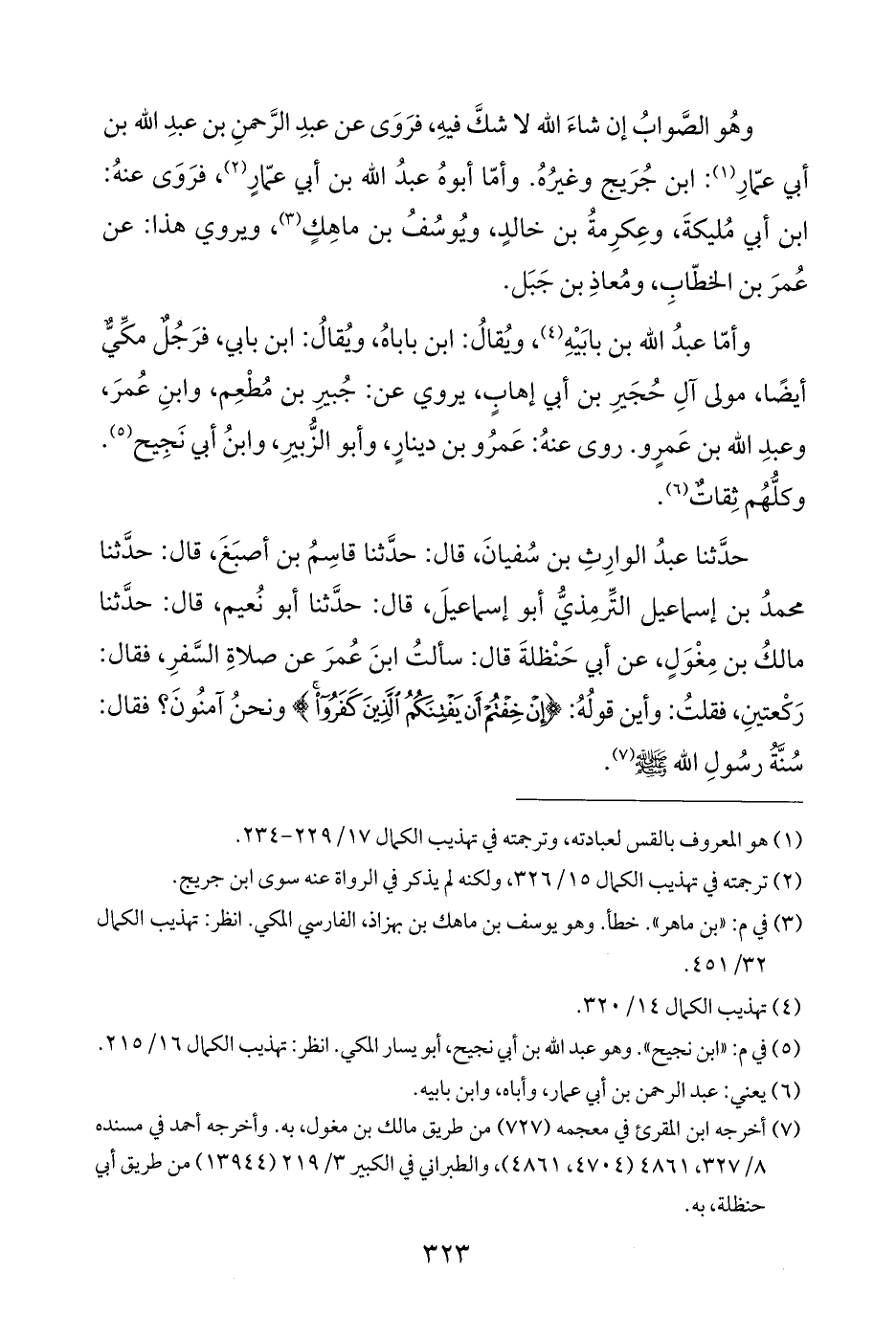 وهُو الصَّوابُ إن شاءَ الله لا شكَّ فيهِ، فرَوَى عن عبدِ الرَّحمنِ بن عبدِ الله بن أبي عمّارِ (¬١): ابن جُرَيج وغيرُهُ. وأمّا أبوهُ عبدُ الله بن أبي عمّارٍ (¬٢)، فرَوَى عنهُ: ابن أبي مُليكةَ، وعِكرِمةُ بن خالدٍ، ويُوسُفُ بن ماهِكٍ (¬٣)، ويروي هذا: عن عُمرَ بن الخطّابِ، ومُعاذِ بن جَبَل.