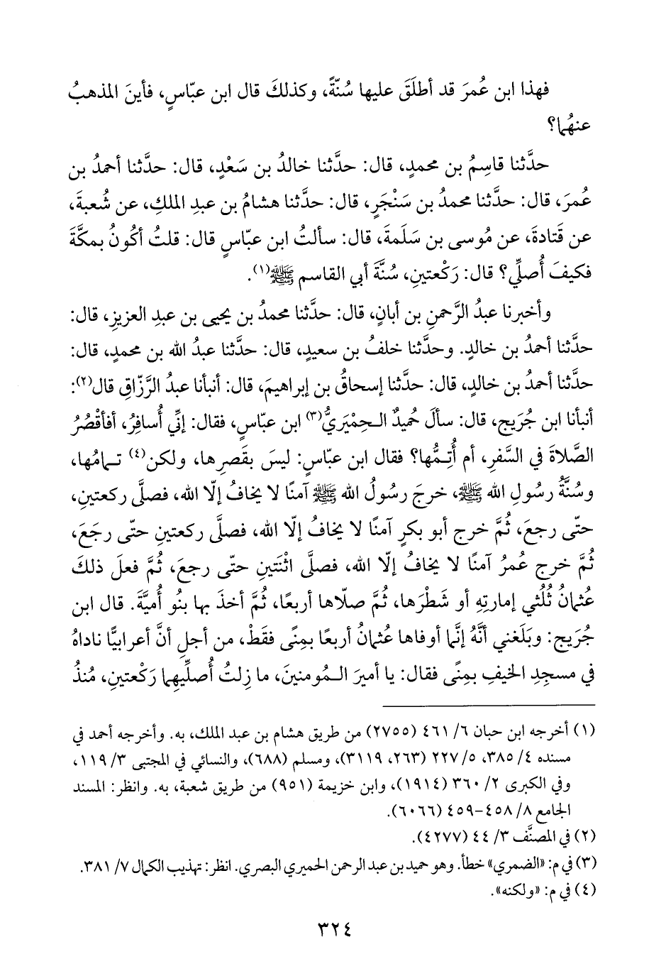 حَدَّثَنَا قاسِمُ بن محمدٍ، قال: حَدَّثَنَا خالدُ بن سَعْدٍ، قال: حَدَّثَنَا أحمدُ بن عُمرَ، قال: حَدَّثَنَا محمدُ بن سَنْجَرٍ، قال: حَدَّثَنَا هشامُ بن عبدِ الملكِ، عن شُعبةَ، عن قَتادةَ، عن مُوسى بن سَلَمةَ، قال: سألتُ ابن عبّاسٍ قال: قلتُ أكُونُ بمكَّةَ فكيفَ أُصلِّي؟ قال: رَكْعتينِ، سُنَّةَ أبي القاسم - صَلَّى اللهُ عَلَيْهِ وَسَلَّمَ - (¬١).