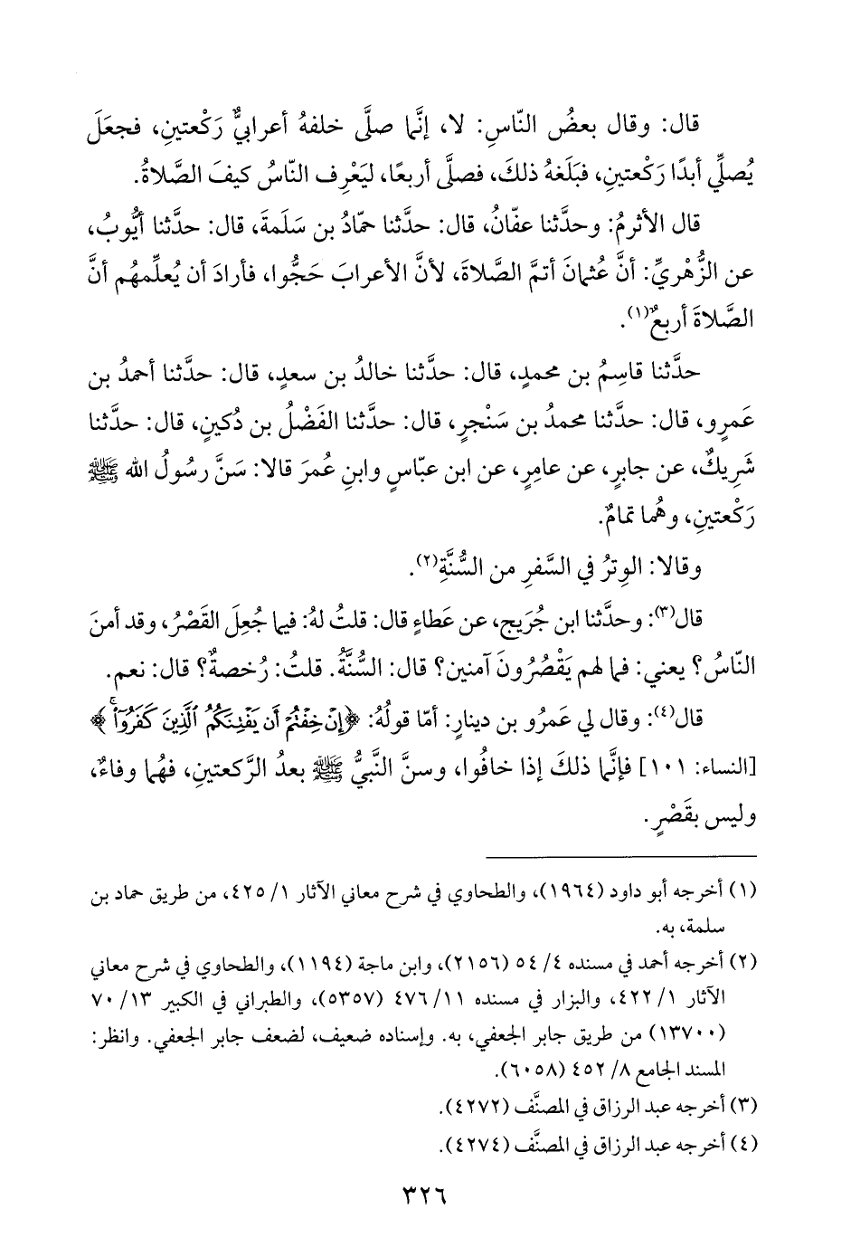 حَدَّثَنَا قاسِمُ بن محمدٍ، قال: حَدَّثَنَا خالدُ بن سعدٍ، قال: حَدَّثَنَا أحمدُ بن عَمرٍو، قال: حَدَّثَنَا محمدُ بن سَنْجرٍ، قال: حَدَّثَنَا الفَضْلُ بن دُكينٍ، قال: حَدَّثَنَا شَرِيكٌ، عن جابرٍ، عن عامِرٍ، عن ابن عبّاسٍ وابنِ عُمرَ قالا: سَنَّ رسُولُ الله - صَلَّى اللهُ عَلَيْهِ وَسَلَّمَ - رَكْعتينِ، وهُما تمامٌ.