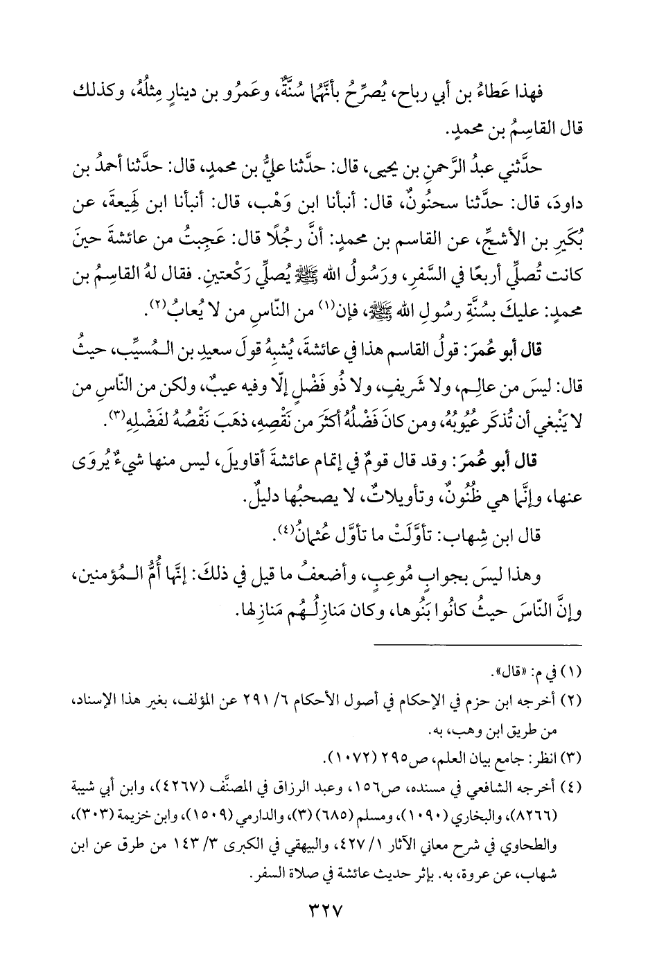 حدَّثني عبدُ الرَّحمنِ بن يحيى، قال: حَدَّثَنَا عليُّ بن محمدٍ، قال: حَدَّثَنَا أحمدُ بن داودَ، قال: حَدَّثَنَا سحنُونٌ، قال: أنبأنا ابن وَهْب، قال: أنبأنا ابن لَهيعةَ، عن بُكَيرِ بن الأشجِّ، عن القاسم بن محمدٍ: أنَّ رجُلًا قال: عَجِبتُ من عائشةَ حينَ كانت تُصلِّي أربعًا في السَّفرِ، ورَسُولُ الله - صَلَّى اللهُ عَلَيْهِ وَسَلَّمَ - يُصلِّي رَكْعتينِ. فقال لهُ القاسِمُ بن محمدٍ: عليكَ بسُنَّةِ رسُولِ الله - صَلَّى اللهُ عَلَيْهِ وَسَلَّمَ -، فإن (¬١) من النّاسِ من لا يُعابُ (¬٢).