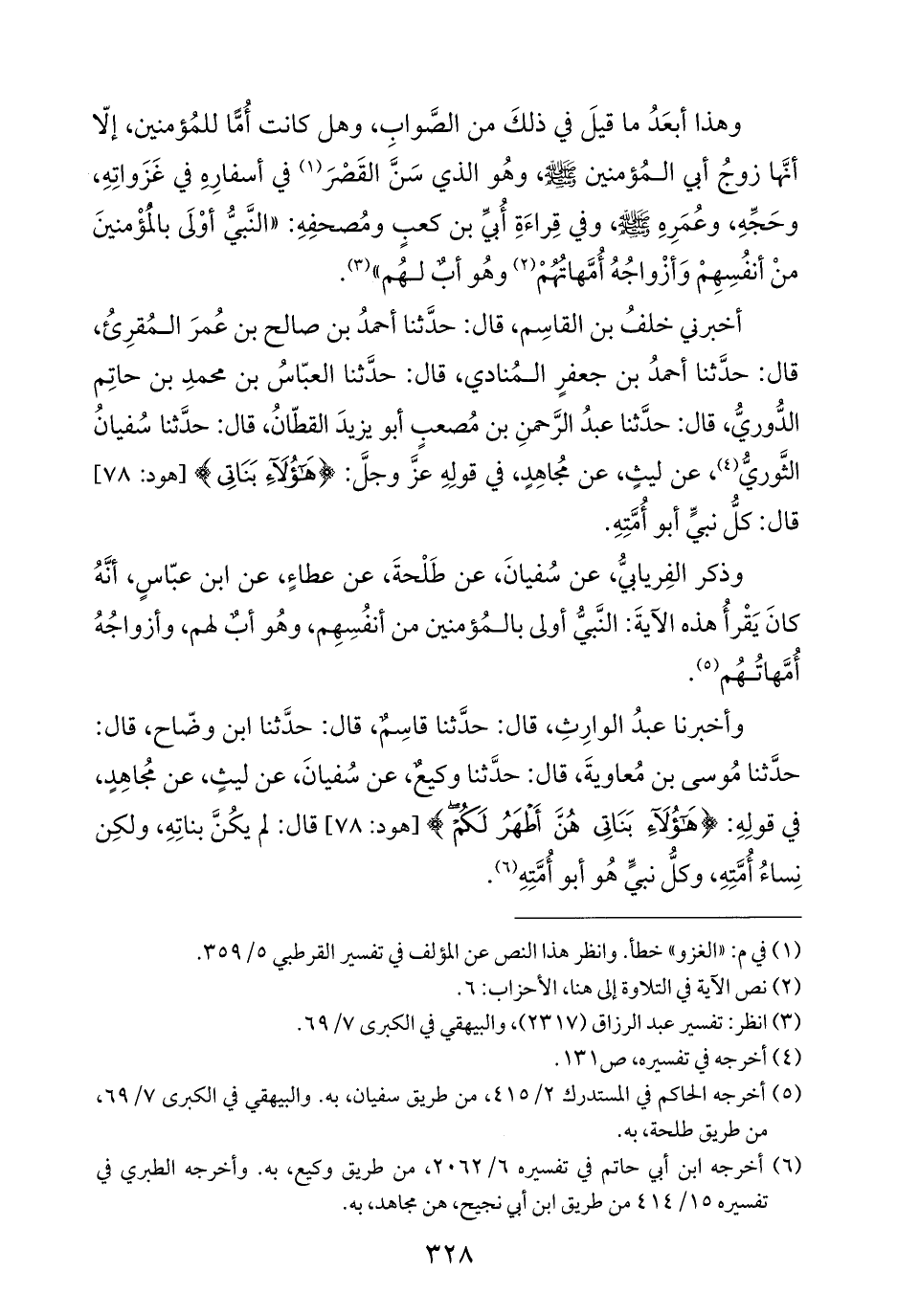 أخبرني خلفُ بن القاسِم، قال: حَدَّثَنَا أحمدُ بن صالح بن عُمرَ المُقرِئُ، قال: حَدَّثَنَا أحمدُ بن جعفرٍ المُنادي، قال: حَدَّثَنَا العبّاسُ بن محمدِ بن حاتِم الدُّوريُّ، قال: حَدَّثَنَا عبدُ الرَّحمنِ بن مُصعبٍ أبو يزيدَ القطّانُ، قال: حَدَّثَنَا سُفيانُ الثَّوريُّ (¬٤)، عن ليثٍ، عن مُجاهِدٍ، في قولِهِ عزَّ وجلَّ: {هَؤُلَاءِ بَنَاتِي} [هود: ٧٨] قال: كلُّ نبيٍّ أبو أُمَّتِهِ.