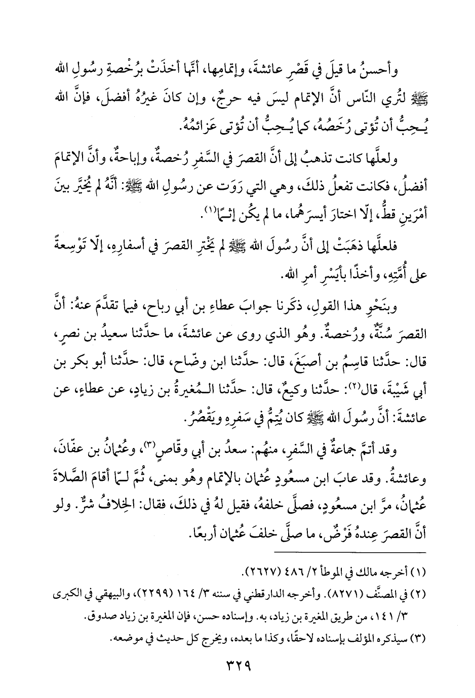 وبنَحْوِ هذا القولِ، ذكَرنا جوابَ عطاءِ بن أبي رباح، فيما تقدَّمَ عنهُ: أنَّ القصرَ سُنَّةٌ، ورُخصةٌ. وهُو الذي روى عن عائشةَ، ما حَدَّثَنَا سعيدُ بن نصرٍ، قال: حَدَّثَنَا قاسِمُ بن أصبَغَ، قال: حَدَّثَنَا ابن وضّاح، قال: حَدَّثَنَا أبو بكر بن أبي شَيْبةَ، قال (¬٢): حَدَّثَنَا وكيعٌ، قال: حَدَّثَنَا المُغيرةُ بن زيادٍ، عن عطاءٍ، عن عائشةَ: أنَّ رسُولَ الله - صَلَّى اللهُ عَلَيْهِ وَسَلَّمَ - كان يُتِمُّ في سَفرِهِ ويَقْصُرُ.