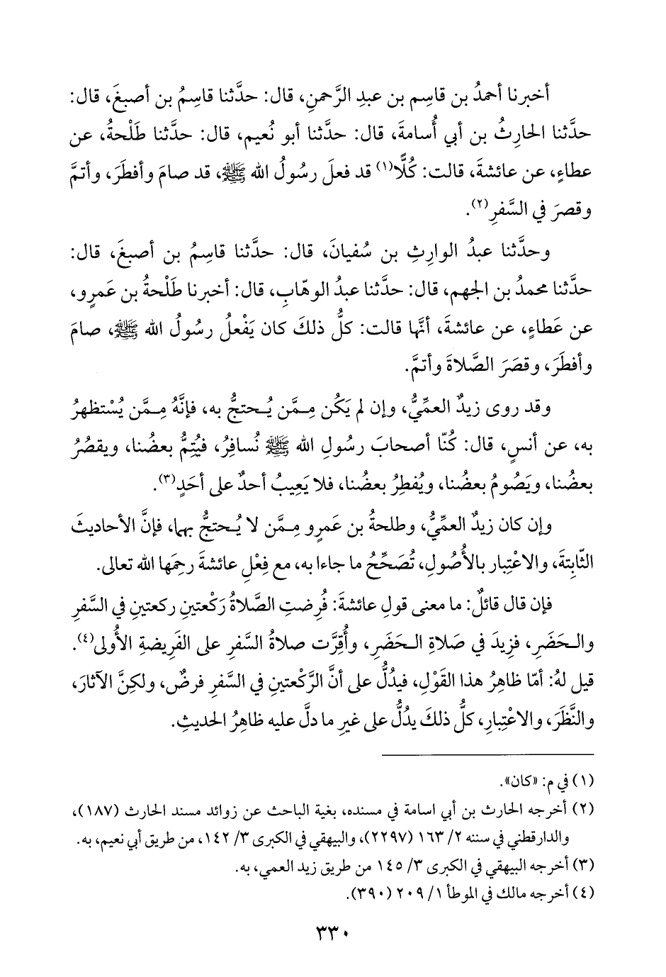 أخبرنا أحمدُ بن قاسِم بن عبدِ الرَّحمنِ، قال: حَدَّثَنَا قاسِمُ بن أصبغَ، قال: حَدَّثَنَا الحارِثُ بن أبي أُسامةَ، قال: حَدَّثَنَا أبو نُعيم، قال: حَدَّثَنَا طَلْحةُ، عن عطاءٍ، عن عائشةَ، قالت: كُلًّا (¬١) قد فعلَ رسُولُ الله - صَلَّى اللهُ عَلَيْهِ وَسَلَّمَ -، قد صامَ وأفطَرَ، وأتمَّ وقصرَ في السَّفرِ (¬٢).