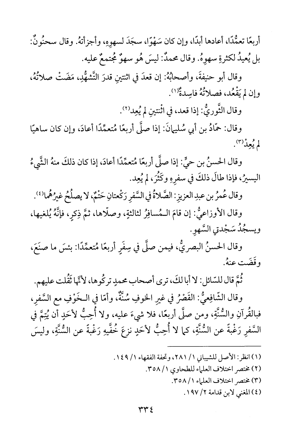 وقال الحسنُ بن حيٍّ: إذا صلَّى أربعًا مُتعمِّدًا أعادَ، إذا كان ذلكَ منهُ الشَّيءُ اليسيرُ، فإذا طالَ ذلكَ في سفرِهِ وكَثُرَ، لَمْ يُعِد.