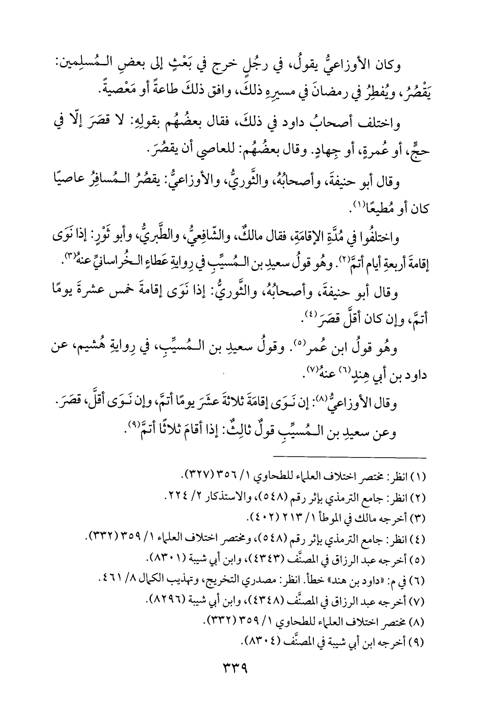 واختلف أصحابُ داود في ذلكَ، فقال بعضُهُم بقولِهِ: لا قصَرَ إلّا في حجٍّ، أو عُمرةٍ، أو جِهادٍ. وقال بعضُهُم: للعاصي أن يقصُرَ.