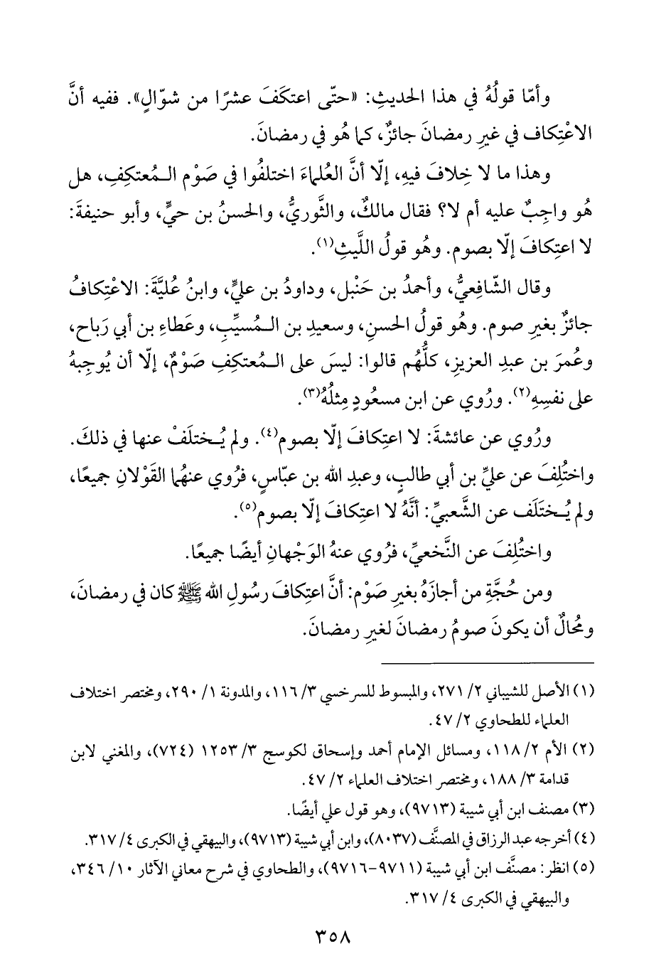 وقال الشّافِعيُّ، وأحمدُ بن حَنْبل، وداودُ بن عليٍّ، وابنُ عُليَّةَ: الاعْتِكافُ جائزٌ بغيرِ صوم. وهُو قولُ الحسنِ، وسعيدِ بن المُسيِّبِ، وعَطاءِ بن أبي رَباح، وعُمرَ بن عبدِ العزيزِ، كلُّهُم قالوا: ليسَ على المُعتكِفِ صَوْمٌ، إلّا أن يُوجِبهُ على نفسِهِ (¬٢). ورُوي عن ابن مسعُودٍ مِثلُهُ (¬٣).