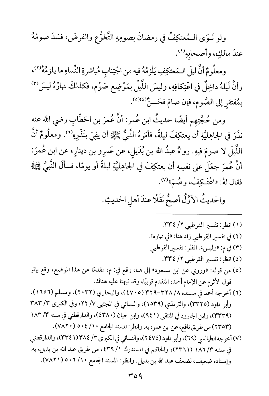 ومعلُولٌ أنَّ ليلَ المُعتكِفِ يَلْزمُهُ فيه من اجْتِنابِ مُباشرةِ النِّساءِ ما يلزمُهُ (¬٢)، وأنَّ لَيْلهُ داخِلٌ في اعْتِكافِهِ، وليسَ اللَّيلُ بمَوْضِع صَوْم، فكذلكَ نهارُهُ ليسَ (¬٣) بمُفتقرٍ إلى الصَّوم، فإن صامَ فحَسنٌ (¬٤) (¬٥).