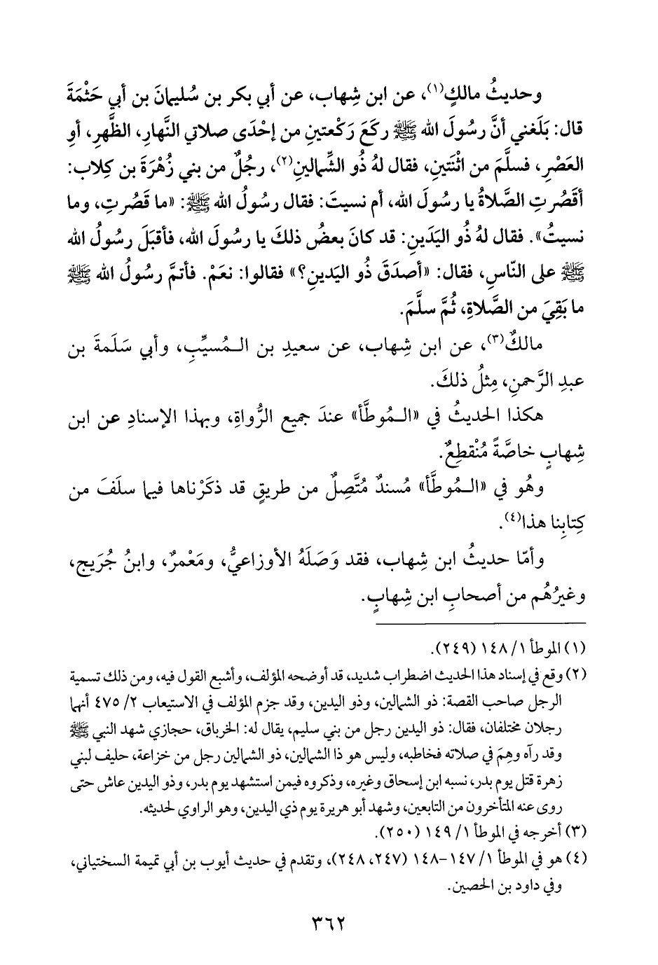 وحديثُ مالكٍ (¬١)، عن ابن شِهاب، عن أبي بكر بن سُليمانَ بن أبي حَثْمَةَ قال: بَلَغني أنَّ رسُولَ الله - صَلَّى اللهُ عَلَيْهِ وَسَلَّمَ - ركَعَ رَكعتينِ من إحْدَى صلاتي النَّهارِ، الظَّهرِ، أوِ العَصْرِ، فسلَّمَ من اثْنَتينِ، فقال لهُ ذُو الشِّمالينِ (¬٢)، رجُلٌ من بني زُهْرَةَ بن كِلاب: أقَصُرتِ الصَّلاةُ يا رسُولَ الله، أم نسيتَ: فقال رسُولُ الله - صَلَّى اللهُ عَلَيْهِ وَسَلَّمَ -: "ما قَصُرتِ، وما نسيتُ". فقال لهُ ذُو اليَدَينِ: قد كَانَ بعضُ ذلكَ يا رسُولَ الله، فأقبَلَ رسُولُ الله - صَلَّى اللهُ عَلَيْهِ وَسَلَّمَ - على النّاسِ، فقال: "أصدَقَ ذُو اليَدينِ؟ " فقالوا: نعَمْ. فأتمَّ رسُولُ الله - صَلَّى اللهُ عَلَيْهِ وَسَلَّمَ - ما بَقِيَ من الصَّلاةِ، ثُمَّ سلَّمَ.