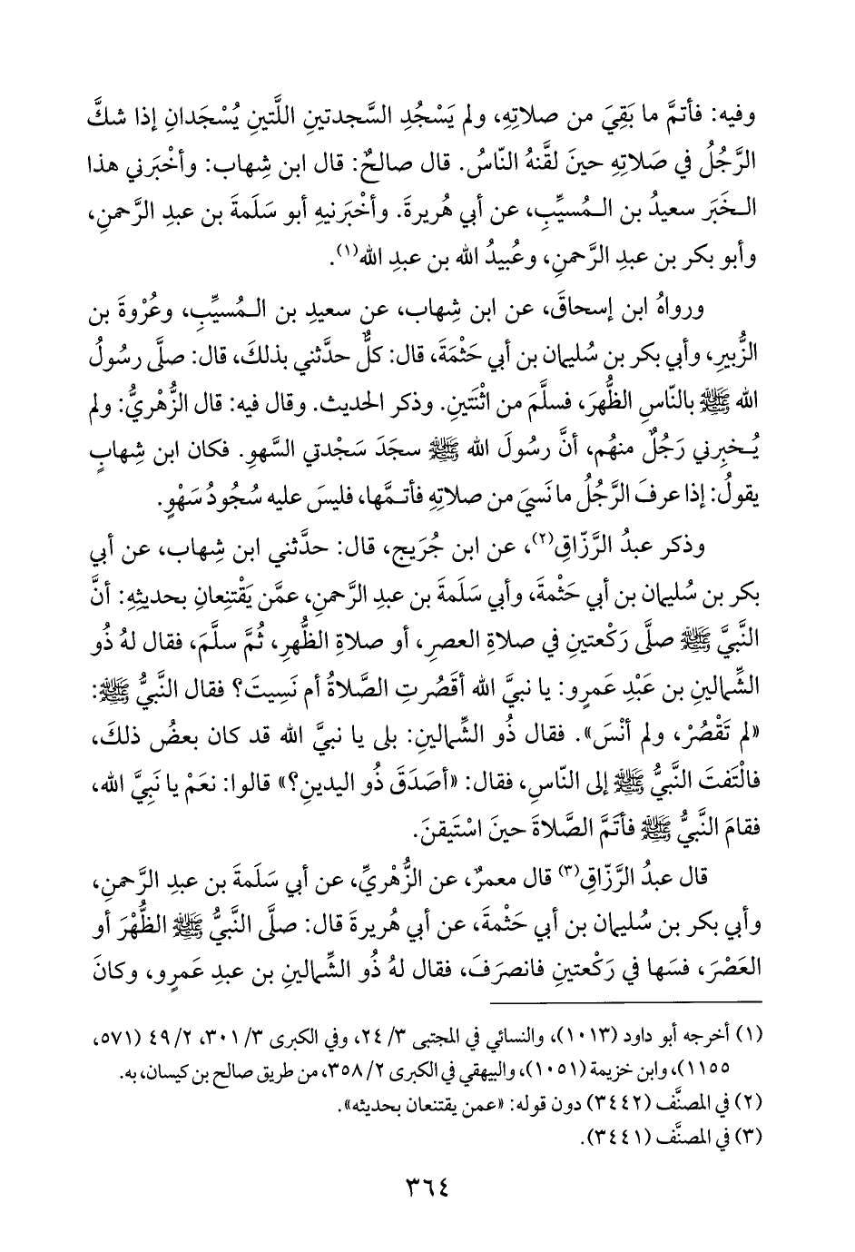 وذكر عبدُ الرَّزّاقِ (¬٢)، عن ابن جُرَيج، قال: حدَّثني ابن شِهابٍ، عن أبي بكر بن سُليمان بن أبي حَثْمةَ، وأبي سَلَمةَ بن عبدِ الرَّحمنِ، عمَّن يَقْتنِعانِ بحديثهِ: أنَّ النَّبيَّ - صَلَّى اللهُ عَلَيْهِ وَسَلَّمَ - صلَّى رَكْعتينِ في صلاةِ العصرِ، أو صلاةِ الظُّهرِ، ثُمَّ سلَّمَ، فقال لهُ ذُو الشِّمَالينِ بن عَبْدِ عَمرٍو: يا نبيَّ الله أقَصُرتِ الصَّلاةُ أم نَسِيتَ؟ فقال النَّبيُّ - صَلَّى اللهُ عَلَيْهِ وَسَلَّمَ -: "لَمْ تَقْصُرْ، ولم أنْسَ". فقال ذُو الشِّمالينِ: بلى يا نبيَّ الله قد كان بعضُ ذلكَ، فالْتَفتَ النَّبيُّ - صَلَّى اللهُ عَلَيْهِ وَسَلَّمَ - إلى النّاسِ، فقال: "أصَدَقَ ذُو اليدينِ؟ " قالوا: نعَمْ يا نَبِيَّ الله، فقامَ النَّبيُّ - صَلَّى اللهُ عَلَيْهِ وَسَلَّمَ - فأتَمَّ الصَّلاةَ حينَ اسْتَيقنَ.
