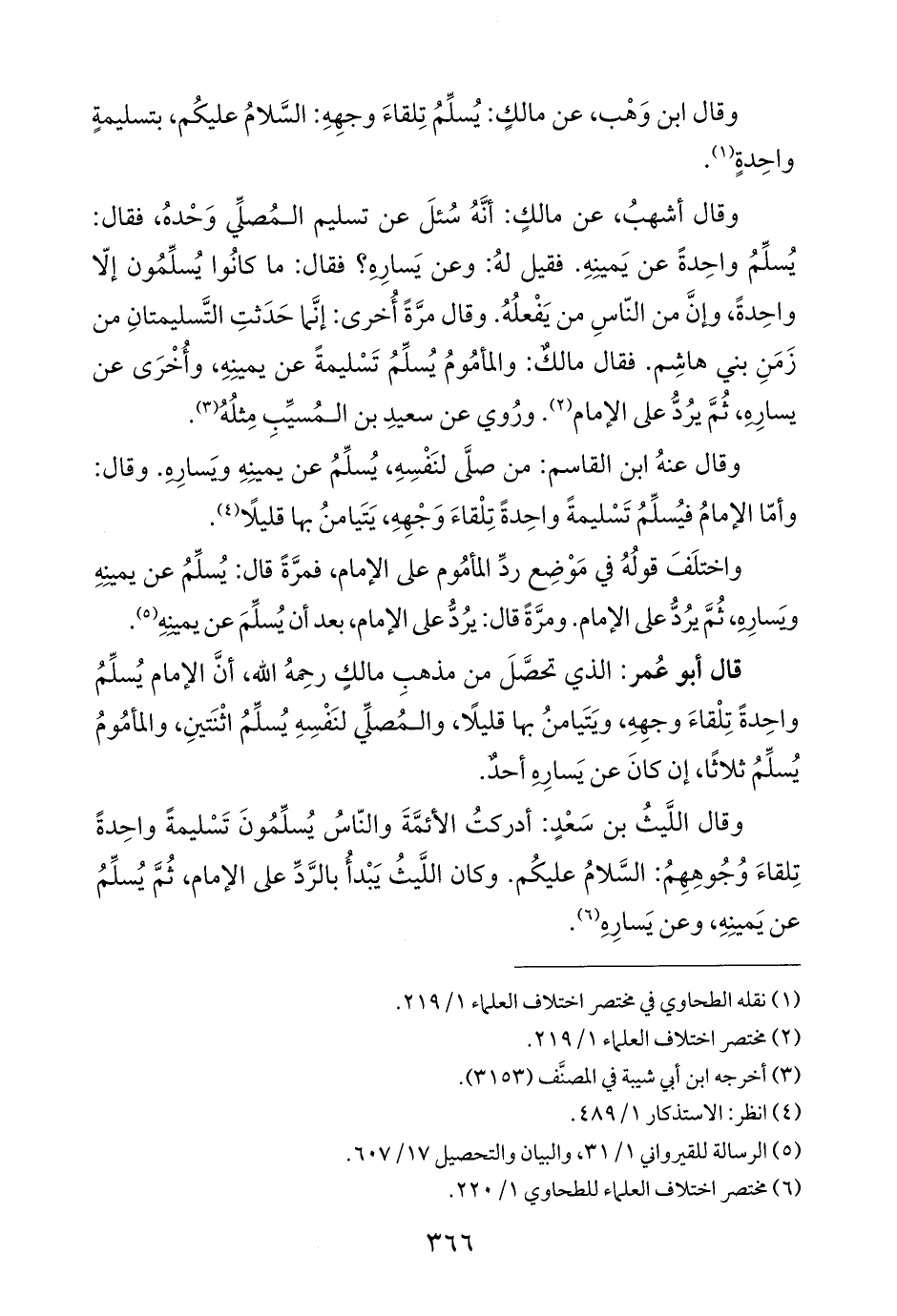 قال أبو عُمر: الذي تحصَّلَ من مذهبِ مالكٍ رحِمهُ الله، أنَّ الإمام يُسلِّمُ واحِدةً تِلْقاءَ وجهِهِ، ويَتَيامنُ بها قليلًا، والمُصلِّي لنَفْسِهِ يُسلِّمُ اثْنَتينِ، والمأمُومُ يُسلِّمُ ثلاثًا، إن كانَ عن يَسارِهِ أحدٌ.