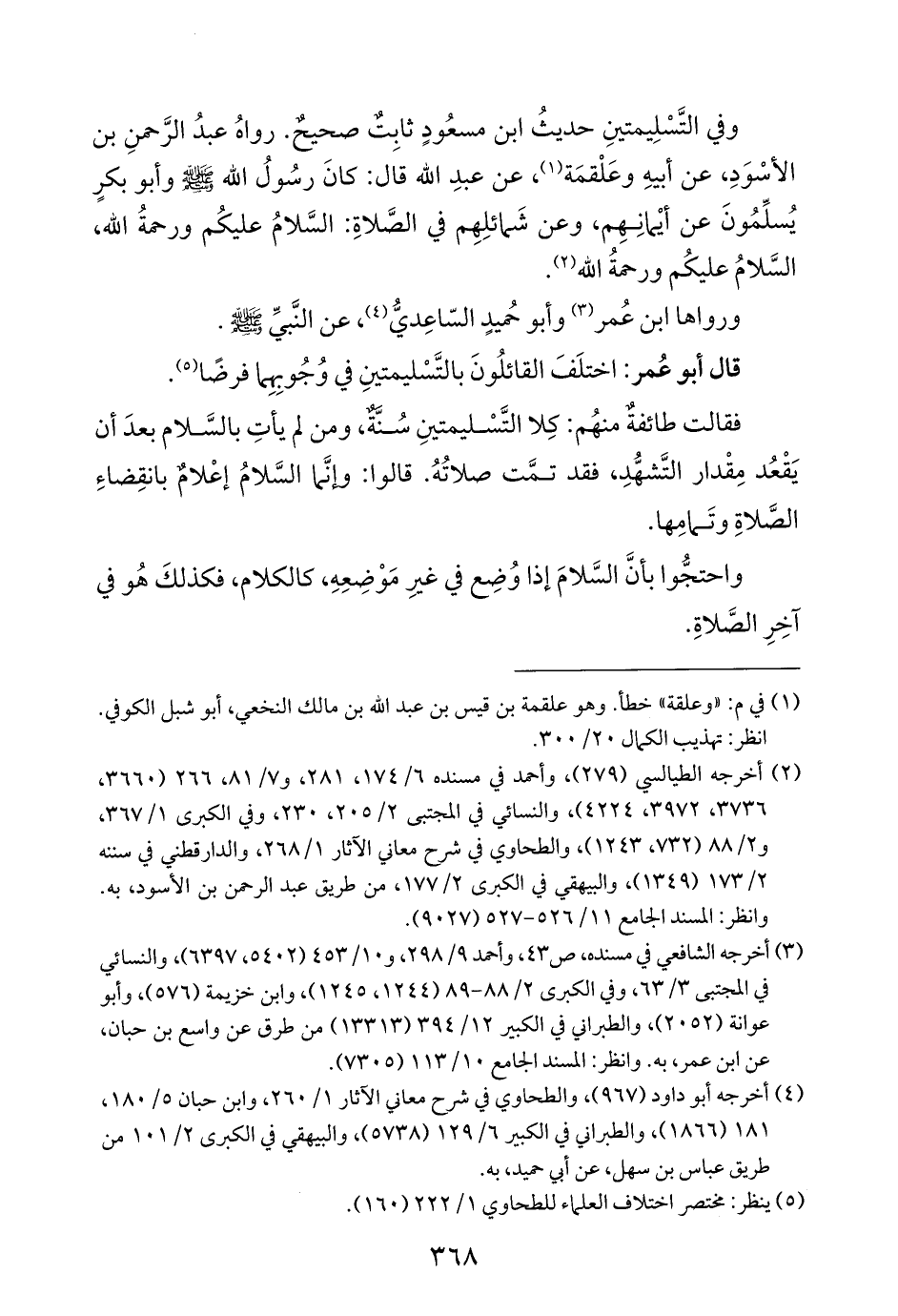 فقالت طائفةٌ منهُم: كِلا التَّسْليمتينِ سُنَّةٌ، ومن لم يأتِ بالسَّلام بعدَ أن يَقْعُد مِقْدار التَّشهُّدِ، فقد تمَّت صلاتُهُ. قالوا: وإنَّما السَّلامُ إعْلامٌ بانقِضاءِ الصَّلاةِ وتَمامِها.