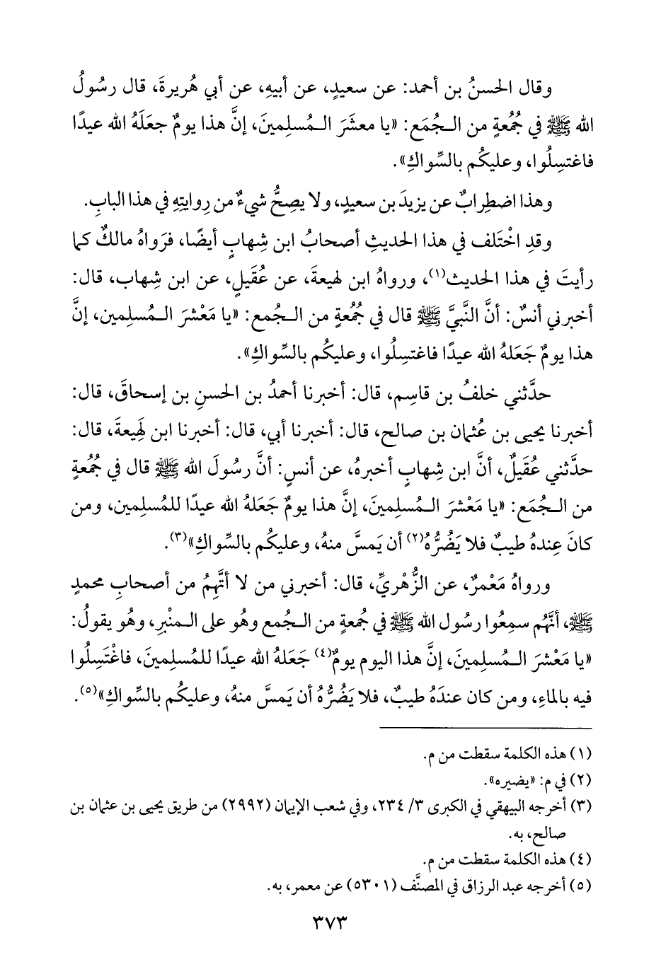 ورواهُ مَعْمرٌ، عن الزُّهْريِّ، قال: أخبرني من لا أتَّهِمُ من أصحابِ محمدٍ - صلى الله عليه وسلم -، أنَّهُم سمِعُوا رسُول الله - صلى الله عليه وسلم - في جُمعةٍ من الجُمع وهُو على المنْبرِ، وهُو يقولُ: "يا مَعْشرَ المُسلِمينَ، إنَّ هذا اليوم يومٌ (¬٤) جَعَلهُ الله عيدًا للمُسلِمينَ، فاغْتَسِلُوا فيه بالماءِ، ومن كان عندَهُ طيبٌ، فلا يَضُر أن يَمسَّ منهُ، وعليكُم بالسِّواكِ" (¬٥).