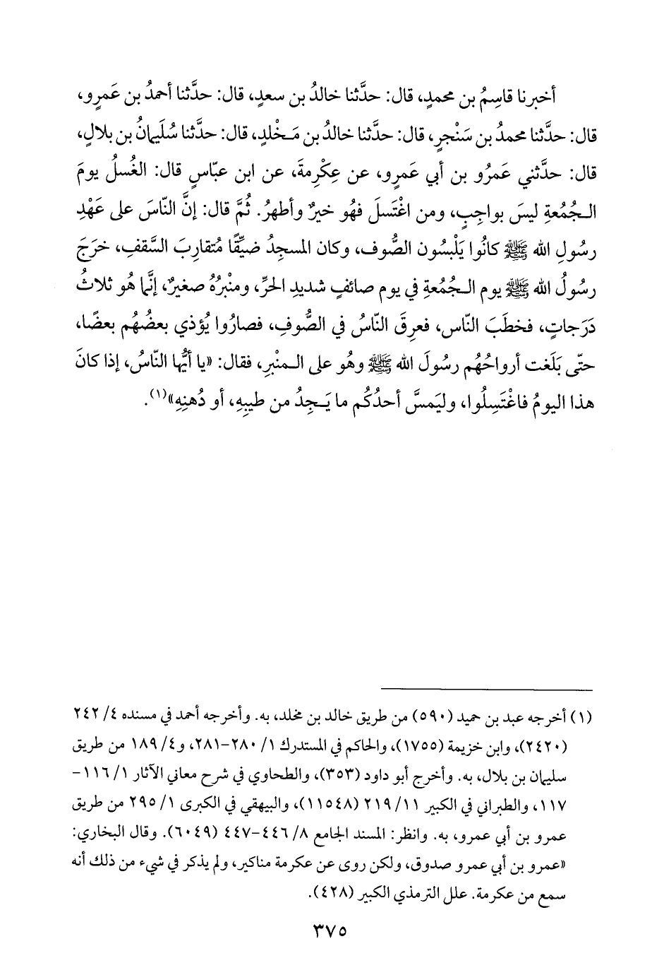 أخبرنا قاسِمُ بن محمدٍ، قال: حدَّثنا خالدُ بن سعدٍ، قال: حدَّثنا أحمدُ بن عَمرٍو، قال: حدَّثنا محمدُ بن سَنْجرٍ، قال: حدَّثنا خالدُ بن مَخْلدٍ، قال: حدَّثنا سُلَيمانُ بن بلالٍ، قال: حدَّثني عَمرُو بن أبي عَمرٍو، عن عِكْرِمةَ، عن ابن عبّاسٍ قال: الغُسلُ يومَ الجُمُعةِ ليسَ بواجِبٍ، ومن اغْتَسلَ فهُو خيرٌ وأطهرُ. ثُمَّ قال: إنَّ النّاسَ على عَهْدِ رسُولِ الله - صلى الله عليه وسلم - كانُوا يَلْبسُون الصُّوف، وكان المسجِدُ ضيِّقًا مُتقارِبَ السَّقفِ، خرَجَ رسُولُ الله - صلى الله عليه وسلم - يوم الجُمُعةِ في يوم صائفٍ شديدِ الحرِّ، ومنْبرُهُ صغيرٌ، إنَّما هُو ثلاث دَرَجاتٍ، فخطَبَ النّاس، فعرِقَ النّاسُ في الصُّوفِ، فصارُوا يُؤذي بعضُهُم بعضًا، حتّى بَلَغت أرواحُهُم رسُولَ الله - صلى الله عليه وسلم - وهُو على المنْبرِ، فقال: "يا أيُّها النّاسُ، إذا كانَ هذا اليومُ فاغْتَسِلُوا، وليَمسَّ أحدُكُم ما يَجِدُ من طيبِهِ، أو دُهنِهِ" (¬١).