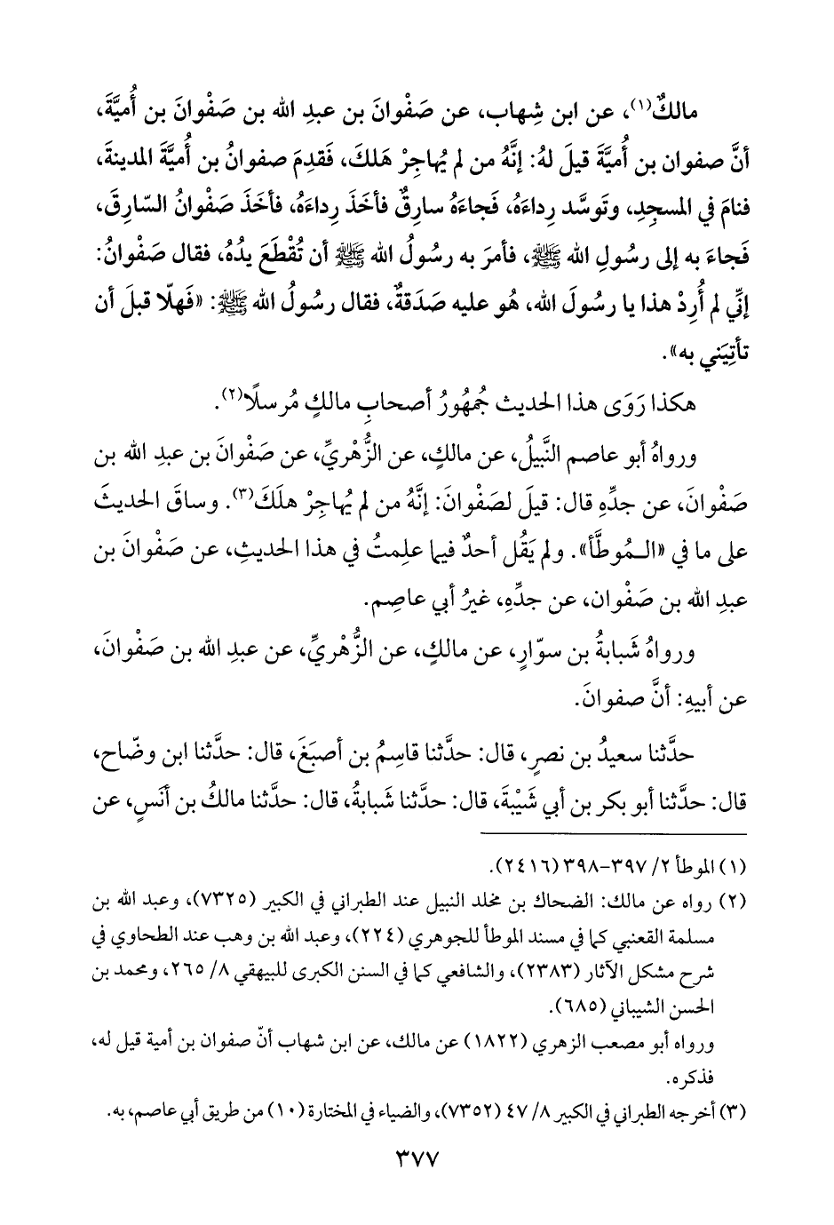 مالكٌ (¬١)، عن ابن شِهاب، عن صَفْوانَ بن عبدِ الله بن صَفْوانَ بن أُميَّةَ، أنَّ صفوان بن أُميَّةَ قيلَ لهُ: إنَّهُ من لم يُهاجِرْ هَلكَ، فَقدِمَ صفوانُ بن أُميَّةَ المدينةَ، فنامَ في المسجِدِ، وتَوسَّد رِداءَهُ، فَجاءَهُ سارِقٌ فأخَذَ رِداءَهُ، فأخَذَ صَفْوانُ السّارِقَ، فَجاءَ به إلى رسُولِ الله - صلى الله عليه وسلم -، فأمرَ به رسُول الله - صلى الله عليه وسلم - أن تُقْطَعَ يدُهُ، فقال صَفْوانُ: إنِّي لم أُرِدْ هذا يا رسُولَ الله، هُو عليه صَدَقةٌ، فقال رسُول الله - صلى الله عليه وسلم -: "فَهلّا قبلَ أن تأتِيَني به".