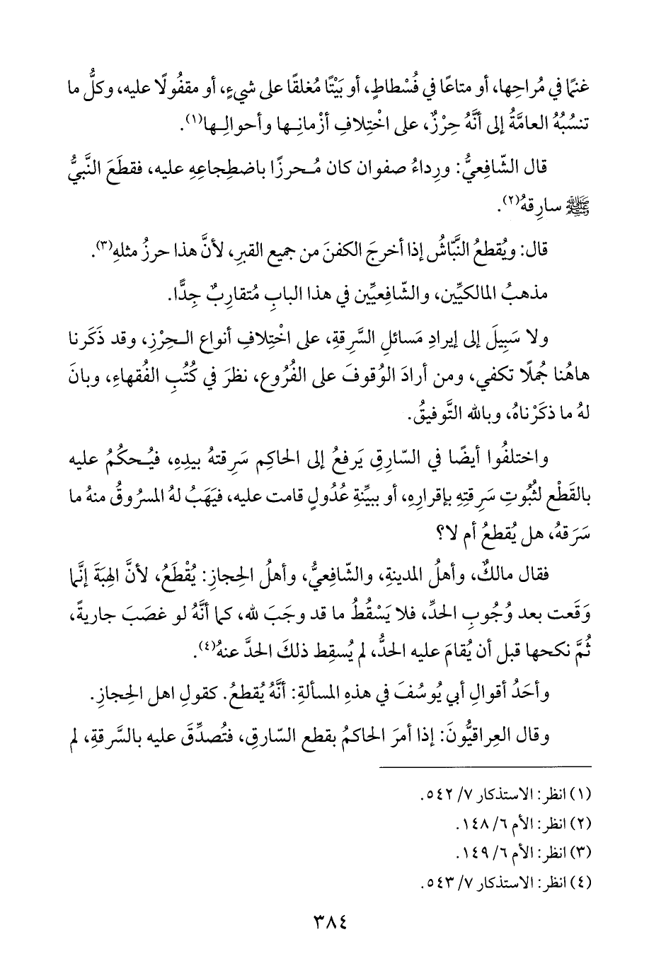 ولا سَبِيلَ إلى إيرادِ مَسائلِ السَّرِقةِ، على اخْتِلافِ أنواع الحِرْزِ، وقد ذَكَرنا هاهُنا جُملًا تكفي، ومن أرادَ الوُقوفَ على الفُرُوع، نظرَ في كُتُبِ الفُقهاءِ، وبانَ لهُ ما ذكَرْناهُ، وبالله التَّوفيقُ.