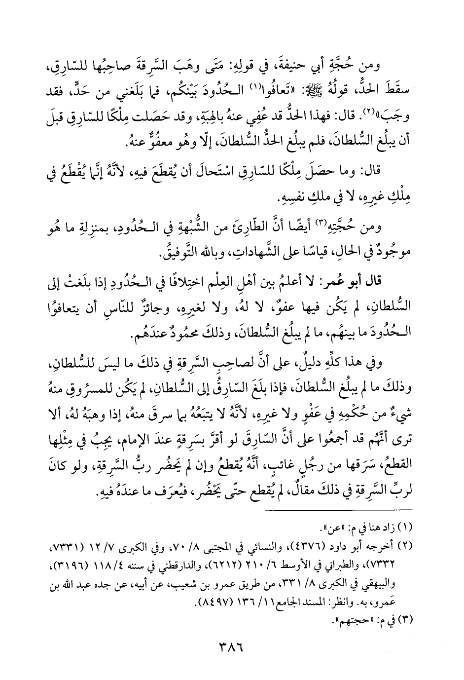 ومن حُجَّةِ أبي حنيفةَ، في قولِهِ: مَتَى وهَبَ السَّرِقةَ صاحِبُها للسّارِقِ، سقَطَ الحدُّ، قولُهُ - صلى الله عليه وسلم -: "تَعافُوا (¬١) الحُدُودَ بَيْنكُم، فما بَلَغني من حَدٍّ، فقد وجَبَ" (¬٢). قال: فهذا الحدُّ قد عُفِي عنهُ بالِهبَةِ، وقد حَصَلت مِلْكًا للسّارِقِ قبلَ أن يبلُغ السُّلطانَ، فلم يبلُغ الحدُّ السُّلطانَ، إلّا وهُو معفُوٌّ عنهُ.