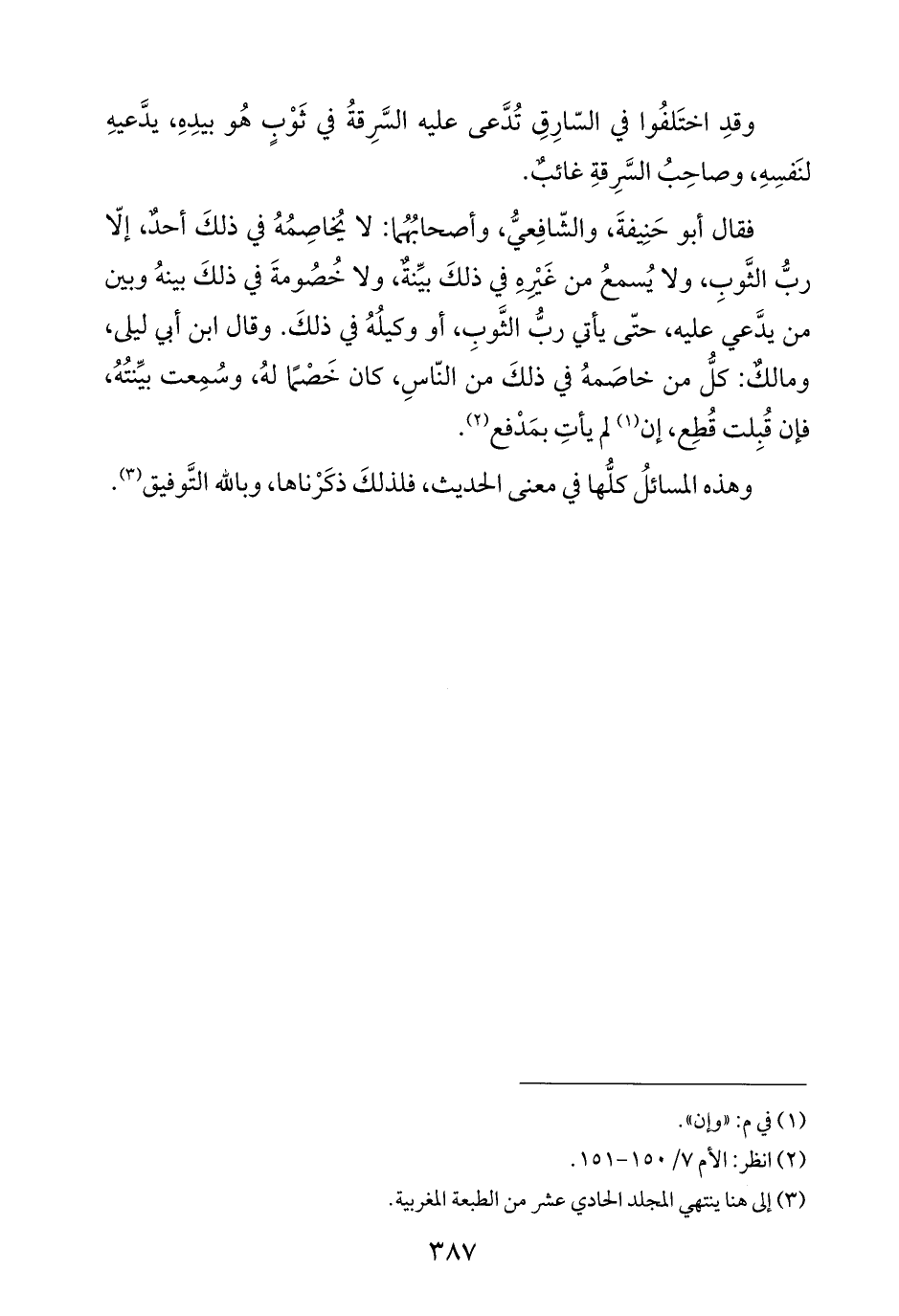 وقدِ اختَلفُوا في السّارِقِ تُدَّعى عليه السَّرِقةُ في ثَوْبٍ هُو بيدِهِ، يدَّعيهِ لنَفسِهِ، وصاحِبُ السَّرِقةِ غائبٌ.