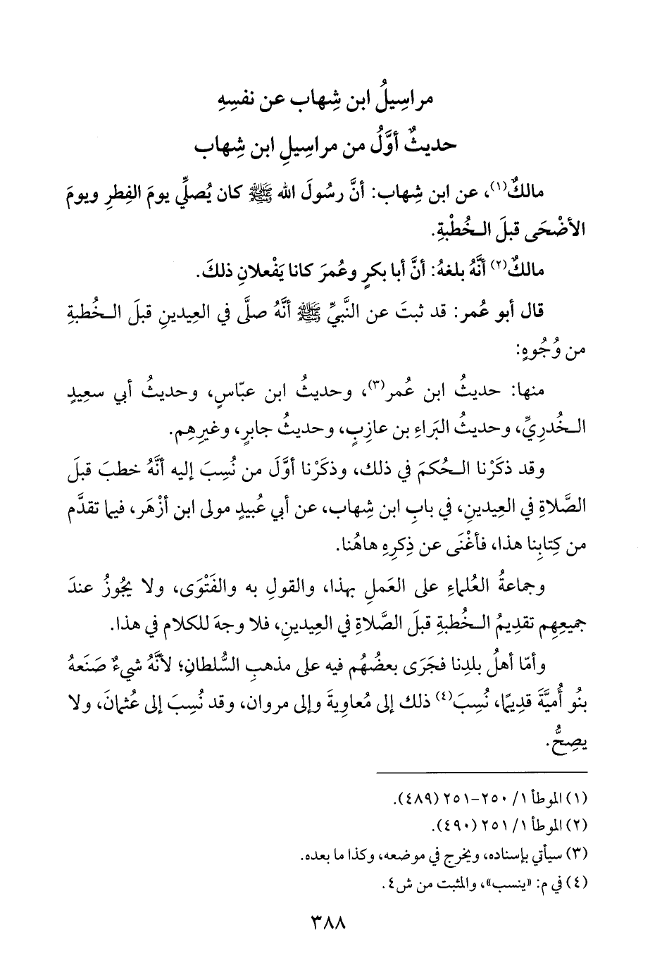مالكٌ (¬١)، عن ابن شِهاب: أنَّ رسُولَ الله - صلى الله عليه وسلم - كان يُصلِّي يومَ الفِطرِ ويومَ الأضْحَى قبلَ الخُطْبةِ.