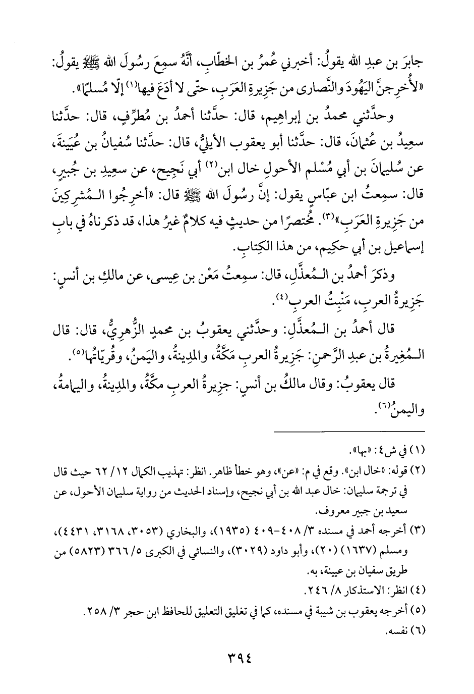 وحدَّثني محمدُ بن إبراهِيم، قال: حدَّثنا أحمدُ بن مُطرِّفٍ، قال: حدَّثنا سعِيدُ بن عُثمانَ، قال: حدَّثنا أبو يعقوب الأيليُّ، قال: حدَّثنا سُفيانُ بن عُيَينةَ، عن سُليمانَ بن أبي مُسْلم الأحولِ خال ابن (¬٢) أبي نَجِيح، عن سعِيدِ بن جُبيرٍ، قال: سمِعتُ ابن عبّاسٍ يقول: إنَّ رسُولَ الله - صلى الله عليه وسلم - قال: "أخرِجُوا المُشرِكِينَ من جَزِيرةِ العَرَبِ" (¬٣). مُختصرًا من حديثٍ فيه كلامٌ غيرُ هذا، قد ذكرناهُ في بابِ إسماعيل بن أبي حكِيم، من هذا الكِتابِ.