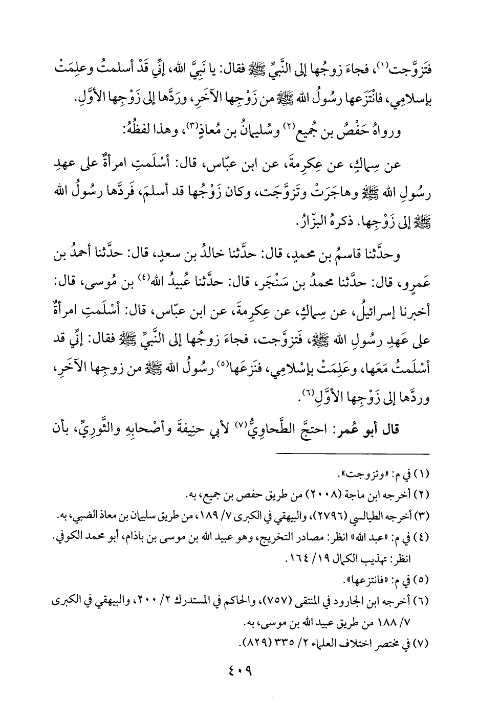 وحدَّثنا قاسمُ بن محمدٍ، قال: حدَّثنا خالدُ بن سعدٍ، قال: حدَّثنا أحمدُ بن عَمرٍو، قال: حدَّثنا محمدُ بن سَنْجَر، قال: حدَّثنا عُبيدُ الله (¬٤) بن مُوسى، قال: أخبرنا إسرائيلُ، عن سِماكٍ، عن عِكرِمةَ، عن ابن عبّاس، قال: أسْلَمتِ امرأةٌ على عَهدِ رسُولِ الله - صلى الله عليه وسلم -، فَتزوَّجت، فجاءَ زوجُها إلى النَّبيِّ - صلى الله عليه وسلم - فقال: إنِّي قد أسْلَمتُ مَعَها، وعَلِمَتْ بإسْلامِي، فنَزعَها (¬٥) رسُولُ الله - صلى الله عليه وسلم - من زوجِها الآخَرِ، وردَّها إلى زَوْجِها الأوَّلِ (¬٦).