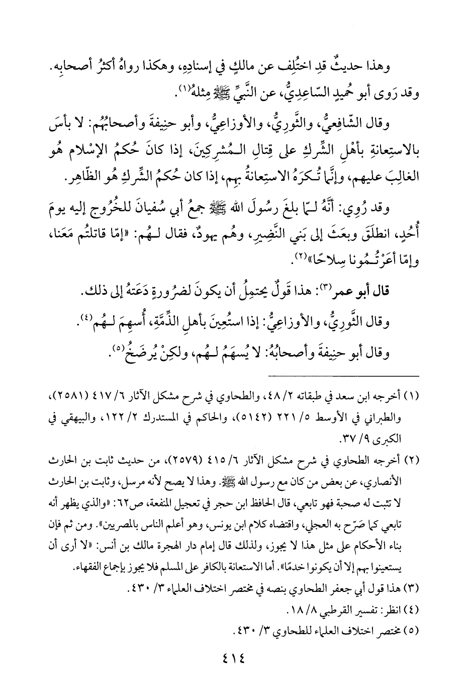 (¬٢) أخرجه الطحاوي في شرح مشكل الآثار ٦/ ٤١٥ (٢٥٧٩)، من حديث ثابت بن الحارث الأنصاري، عن بعض من كان مع رسول الله - صلى الله عليه وسلم -. وهذا لا يصح لأنه مرسل، وثابت بن الحارث لا تثبت له صحبة فهو تابعي، قال الحافظ ابن حجر في تعجيل المنفعة، ص ٦٢: "والذي يظهر أنه تابعي كما صَرّح به العجلي، واقتضاه كلام ابن يونس، وهو أعلم الناس بالمصريين". ومن ثم فإن بناء الأحكام على مثل هذا لا يجوز، ولذلك قال إمام دار الهجرة مالك بن أنس: "لا أرى أن يستعينوا بهم إلا أن يكونوا خدمًا". أما الاستعانة بالكافر على المسلم فلا يجوز بإجماع الفقهاء.