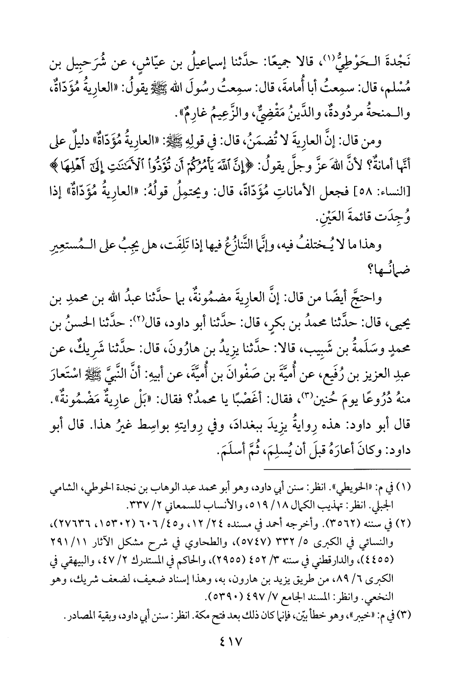 واحتجَّ أيضًا من قال: إنَّ العارِيةَ مضمُونةٌ، بما حدَّثنا عبدُ الله بن محمدِ بن يحيى، قال: حدَّثنا محمدُ بن بكرٍ، قال: حدَّثنا أبو داود، قال (¬٢): حدَّثنا الحسنُ بن محمدٍ وسَلَمةُ بن شَبِيب، قالا: حدَّثنا يزِيدُ بن هارُونَ، قال: حدَّثنا شَرِيكٌ، عن عبدِ العزيز بن رُفَيع، عن أُميَّةَ بن صَفْوانَ بن أُميَّةَ، عن أبيهِ: أنَّ النَّبيَّ - صلى الله عليه وسلم - اسْتَعارَ منهُ دُرُوعًا يومَ حُنين (¬٣)، فقال: أغَصْبًا يا محمدُ؟ فقال: "بَلْ عارِيةٌ مَضْمُونةٌ". قال أبو داود: هذه رِوايةُ يزِيدَ ببغدادَ، وفي رِوايتهِ بواسِط غيرُ هذا. قال أبو داود: وكانَ أعارَهُ قبلَ أن يُسلِمَ، ثُمَّ أسلَمَ.
