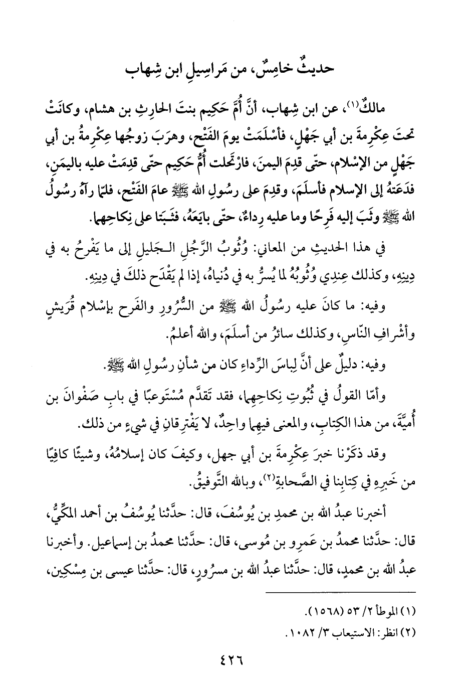 مالكٌ (¬١)، عن ابن شِهاب، أنَّ أُمَّ حَكِيم بنتَ الحارِثِ بن هشام، وكانَتْ تحتَ عِكْرِمةَ بن أبي جَهْلٍ، فأسْلَمَتْ يومَ الفَتْح، وهرَبَ زوجُها عِكْرِمةُ بن أبي جَهْلٍ من الإسْلام، حتَّى قدِمَ اليمنَ، فارْتَحلت أُمُّ حَكِيم حتَّى قدِمَتْ عليه باليمَنِ، فدَعَتهُ إلى الإسلام فأسلَمَ، وقدِمَ على رسُولِ الله - صلى الله عليه وسلم - عامَ الفَتْح، فلمّا رآهُ رسُولُ الله - صلى الله عليه وسلم - وثَبَ إليه فَرِحًا وما عليه رِداءٌ، حتَّى بايَعَهُ، فثَبَتا على نِكاحِهما.